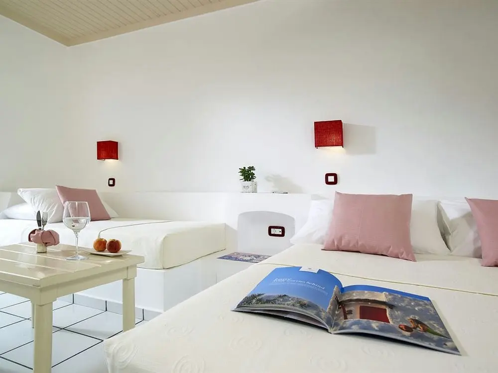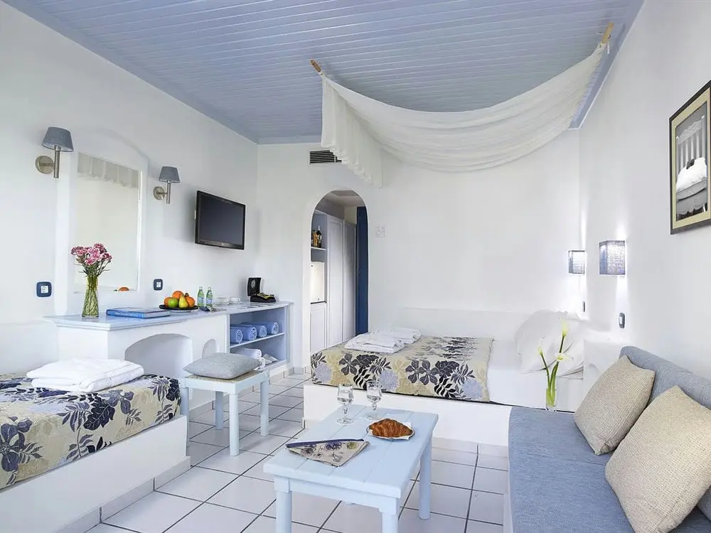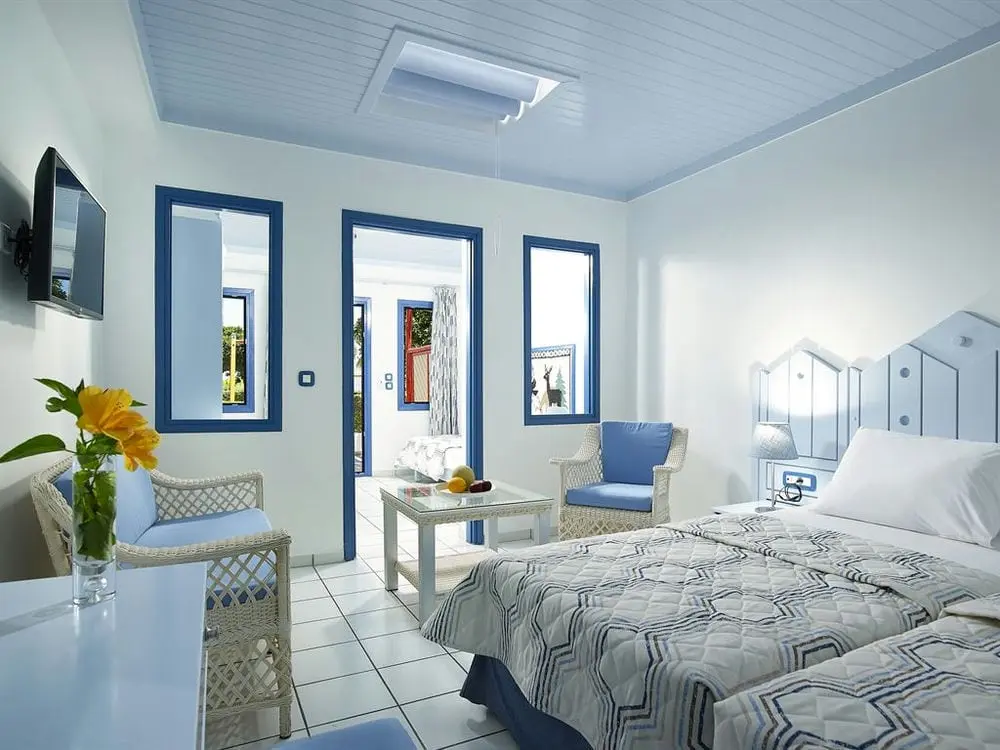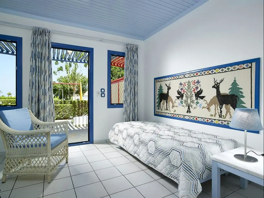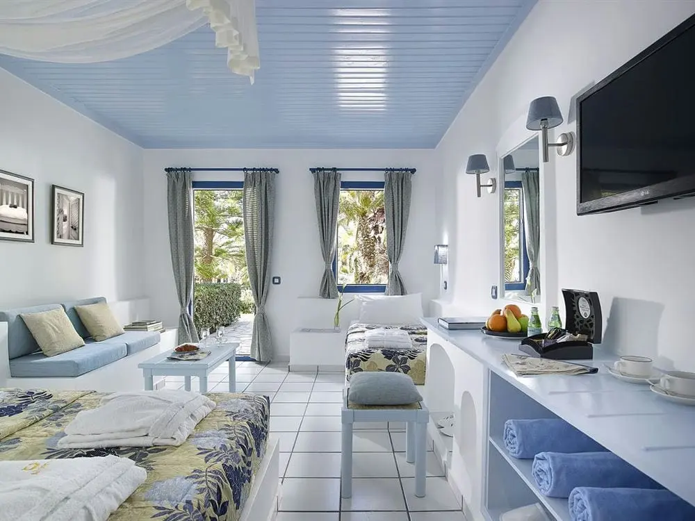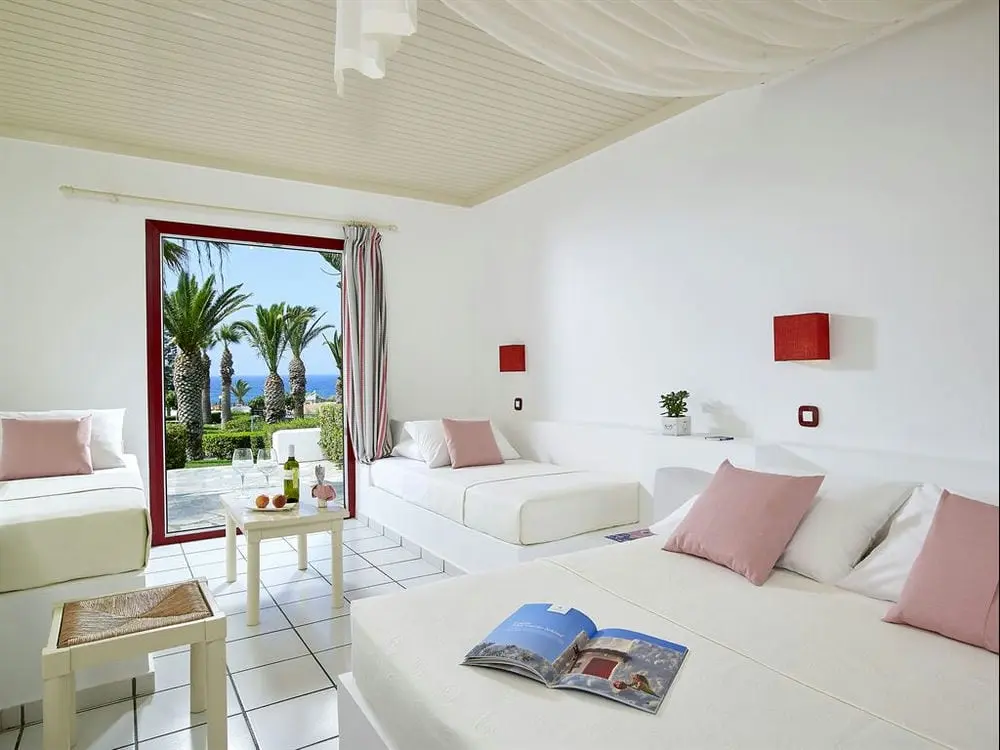 Family Аpartment Вид на сад или море, гостиная (2 односпальные кровати) и спальня (двуспальная кровать).