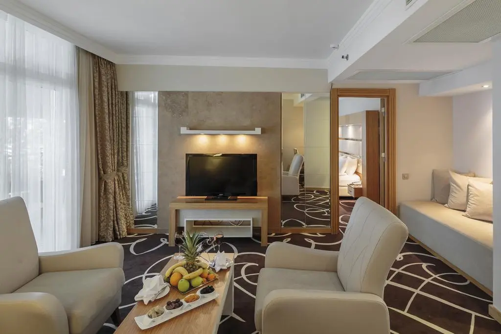 18 двухкомнатных terrace suite room (терраса с прямым видом на море, гостиная, спальня с frenchn bed, ванная с гидравлическим массажем, макс. 3+1 чел., 57 м2).В номере: