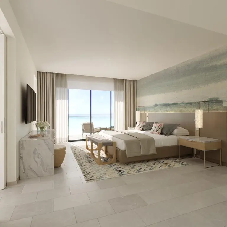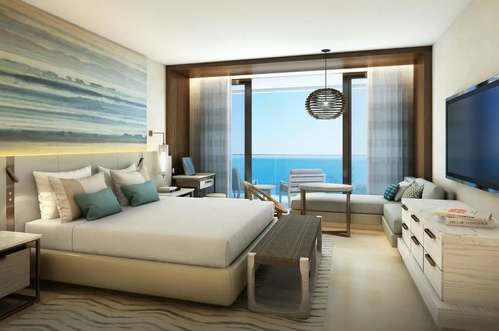 Deluxe Suite with One Bedroom (90 м2, макс. 2+2 чел.) – спальня и гостиная, разделенные дверью, ванная комната, балкон с видом на море;
