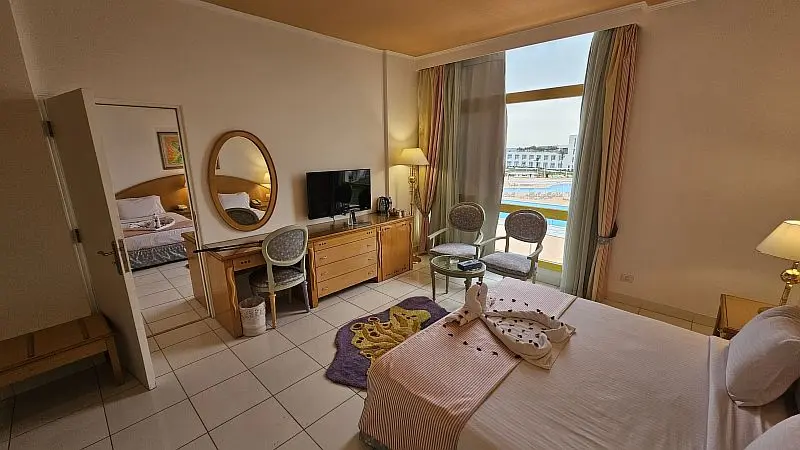 - Семейный номер (вид на бассейн/частичный вид на море) - Одна Master спальня с кроватью размера King Size, одна детская комната с двумя односпальными кроватями, ванная комната с ванной, французское окно/балкон