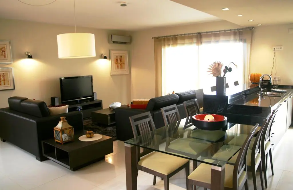 Трехкомнатная квартира, полностью меблированная и оборудованная, расположена на первом этаже. Из главной комнаты есть выход на террасу, также обставленную садовой мебелью.