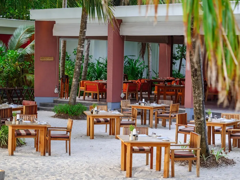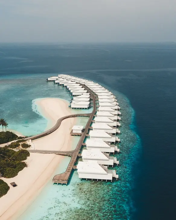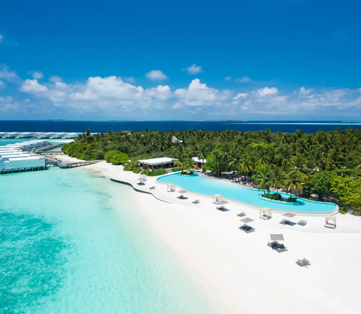 Reef Water Pool Villa (220 кв. м (внутри 130 кв. м, снаружи 90 кв. м), макс. 3 или 2+2 чел.). Водные виллы расположены прямо на краю рифа, что дает уникальную возможность для занятий снорклингом, спустившись в океан непосредственно с террасы своего номера. Отдельные зоны спальни и гостиной, ванная комната. Частный бассейн, лежаки, тахта для отдыха, обеденный столик и стулья на террасе.