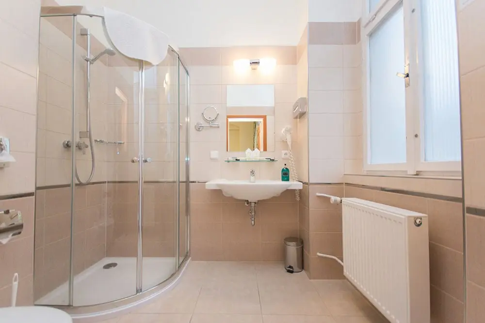 Double Economy (5 номеров) - площадь номера 14 - 15 м2, макс. 2 взрослых человека на главной постели, ванная комната с душевой кабиной, вид на стену.