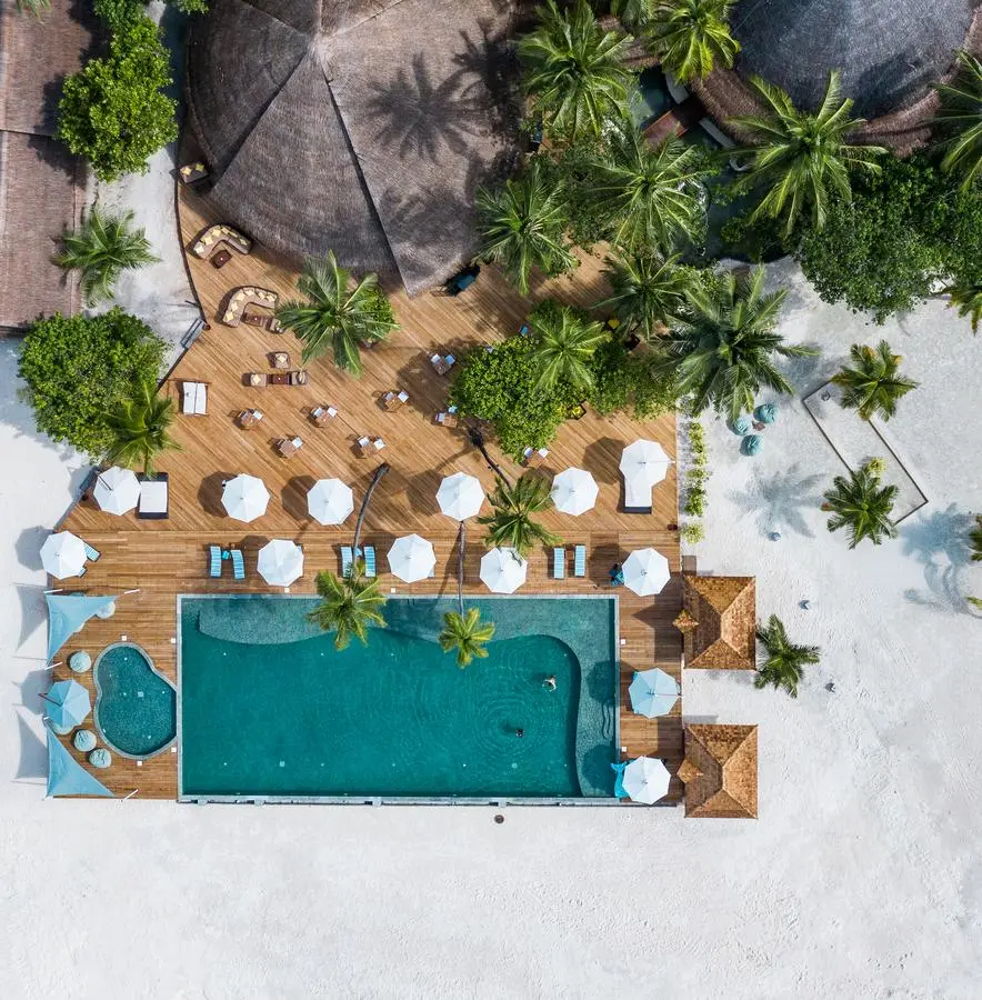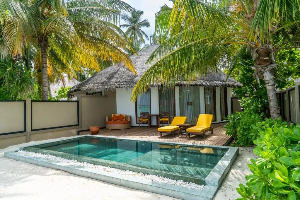 Velavaru Villas (323 кв.м.) Расположены на берегу. Спальни, гостиная, ванная комната, душ на открытом воздухе,меблированная терраса с собственным бассейном, сад с шезлонгами, выход на пляж. Может объединяться с Beachfront Jet Pool Villa.