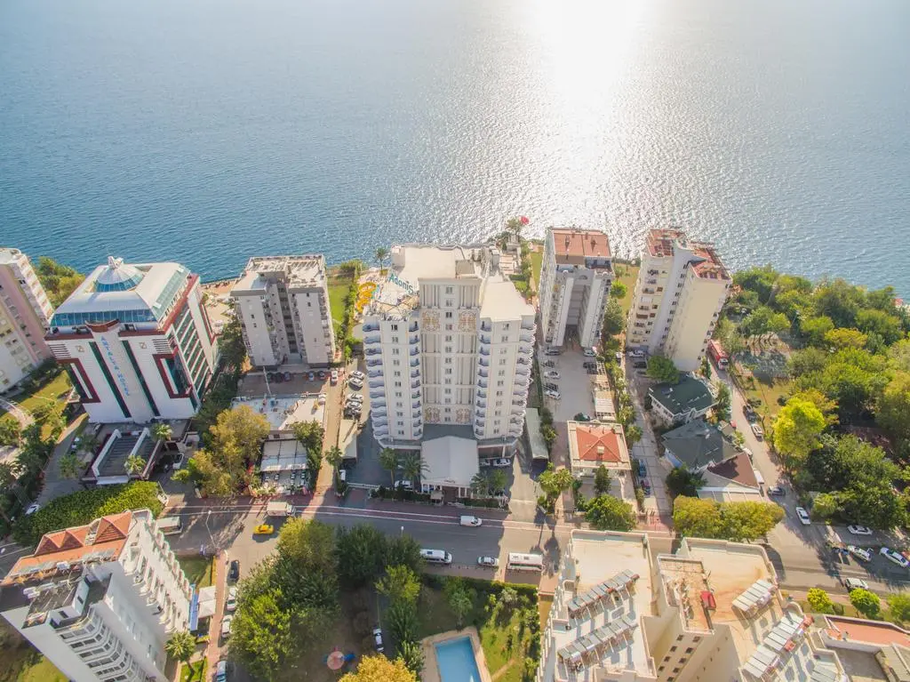 в 15 км от аэропорта, в 5 км от центра г. Анталья, на высоком берегу моря.