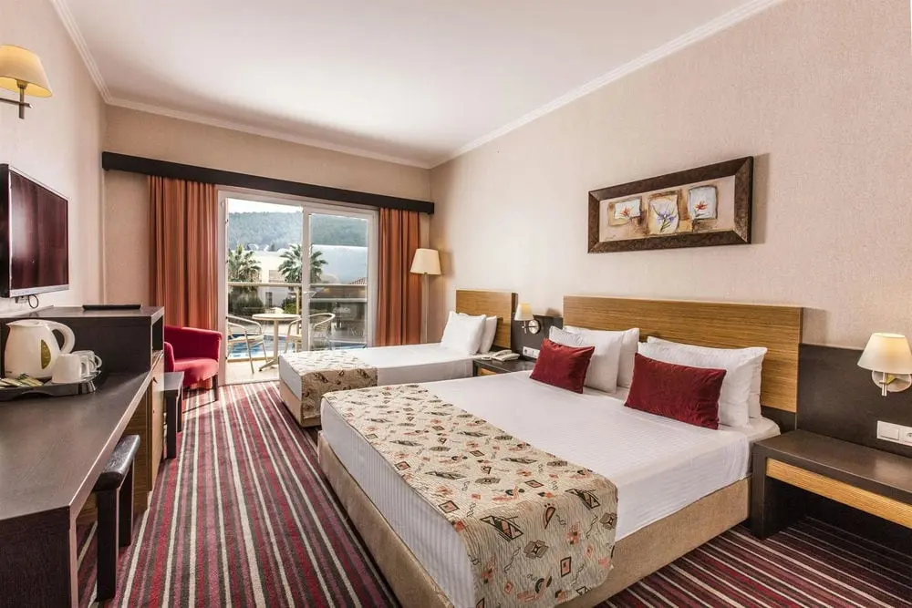 Отель расположен в 9 км. от центра г. Кушадасы, на берегу моря. Расстояние до аэропорта Измир 65 км. Гости отеля могут бесплатно пользоваться большим аквапарком на 4 тыс. человек (платно только бары и рестораны на территории аквапарка).