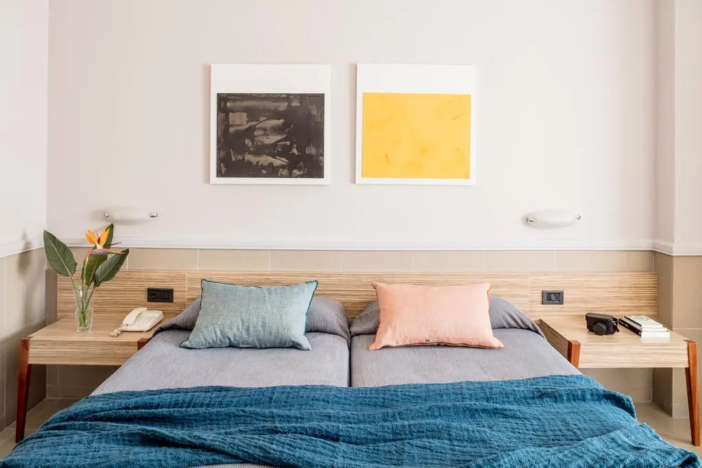 suite duplex - первый этаж: спальня с супружеской кроватью и ванная с душевой кабиной, балкон; второй этаж: гостиная с диван-кроватью на 2 чел., письменный стол, пляжные и полотенца и для бассейна, терраса с видом на море.
