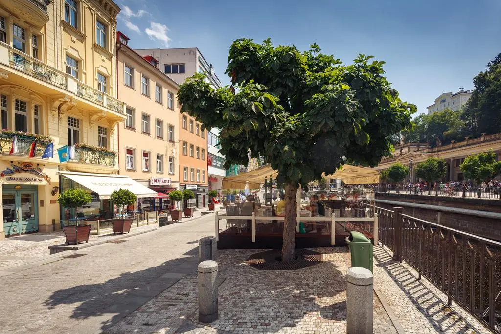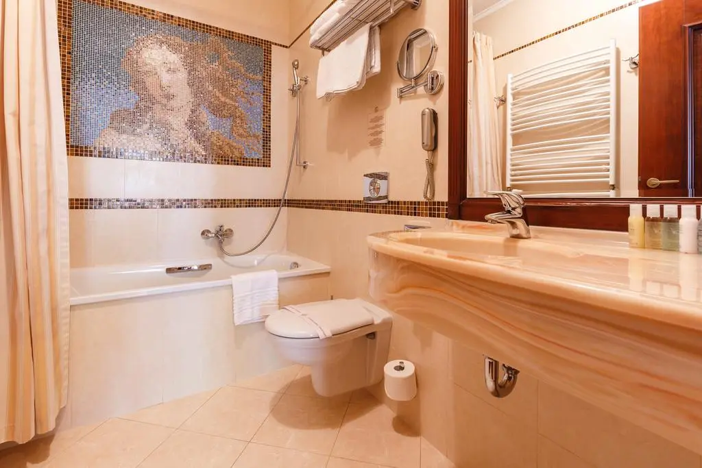 Во многих ваннах из мозаики на стенах выложен фрагмент картины Боттичелли «Рождение Венеры». Керамика от пани Каминовой, дочери известнейшего скульптора 20 века пана Kv?tenskoho, чьи работы украшают многие улицы и богатейшие дома Чехии, Словакии, Австрии, не может оставить равнодушным ни одного человека. Рыбы, морские звёзды, водоросли, раковины с жемчугом - обитатели морей и океанов, словно живые проплывают мимо гостей отеля. Витражи на лестничных маршах отеля. Выполненные по картинам известного чешского художника Альфонса Мухи, они вносят особый колорит праздника и красоты.