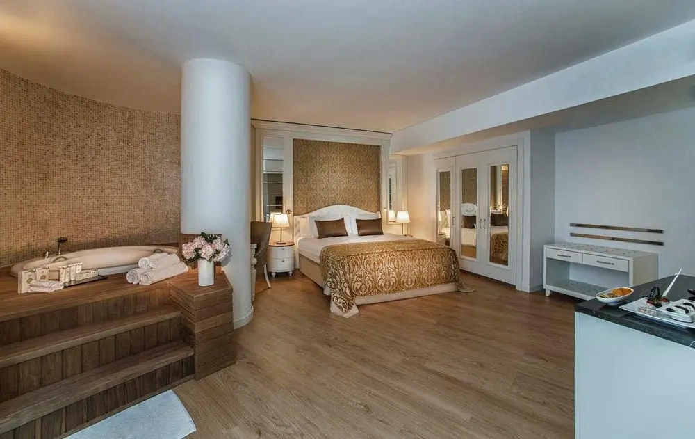 В собственной ванной комнате с бесплатными туалетно-косметическими принадлежностями и феном установлен душ. В некоторых номерах есть балкон, а из некоторых номеров открывается вид на окрестности или бассейн. После регистрации отъезда гости могут воспользоваться номером с собственной ванной комнатой. Ежедневно сервируется завтрак, обед и ужин «шведский стол». Зимой открыты 2 ресторана, а летом — 4 ресторана, где по меню подают разнообразные блюда традиционной турецкой, дальневосточной и итальянской кухни. В барах можно заказать различные напитки. Предусмотрено специальное детское меню. Обустроена игровая площадка и комната для игр. Дети могут посмотреть фильмы или посетить аквапарк с различными водными развлечениями.