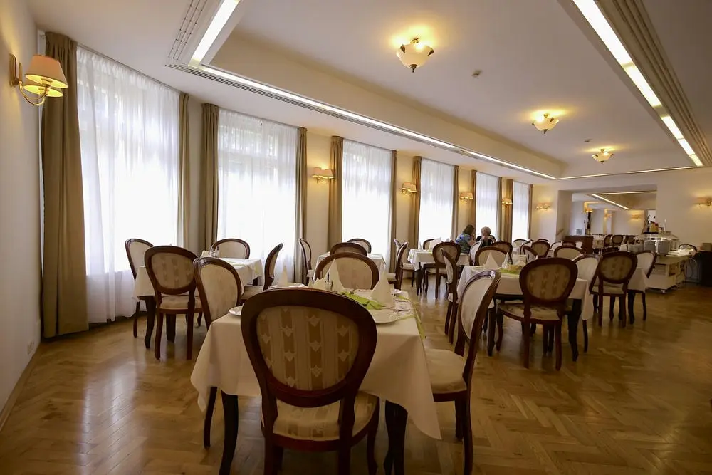 Завтрак подается в форме буфета, предлагается большой выбор мясных и молочных продуктов, овощей и выпечки. Предложение дополнено теплыми блюдами и предложением по меню. Из напитков утром предлагается кофе, молоко, различные виды чая, фруктовый сок. Основные блюда дня - обед и ужин – клиент может выбрать из двенадцати видов блюд, каждый день и каждое главное блюдо. Салаты и горячие овощи подаются в форме буфета.