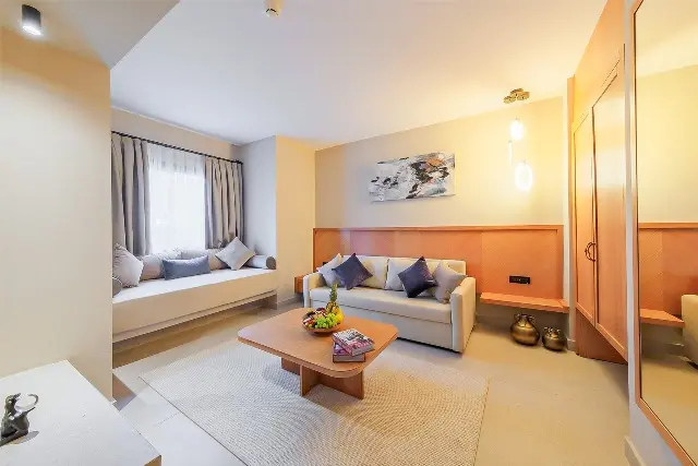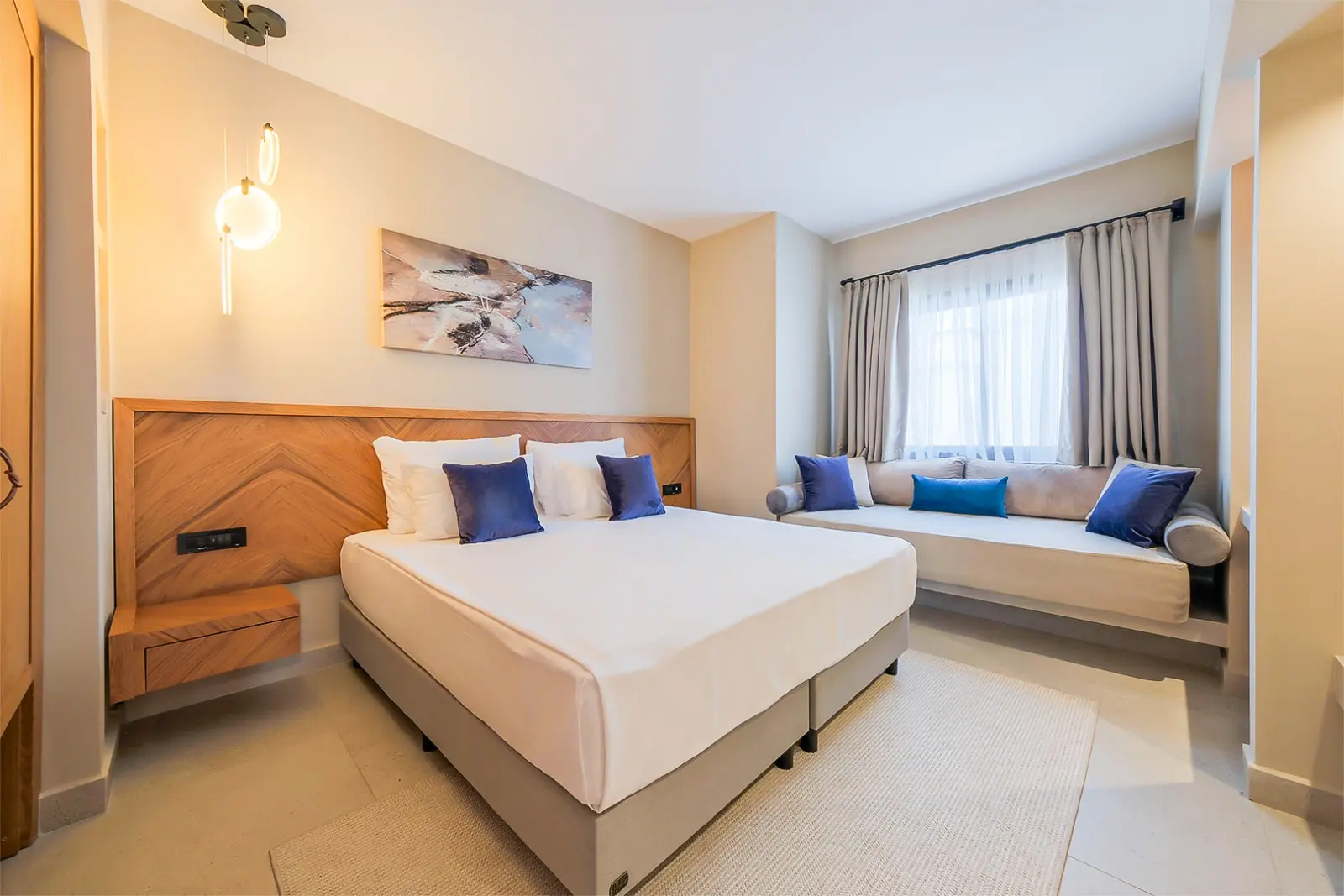 Номер: 45 кв.м, спальня и гостиная, двуспальная кровать и 3 софы, 1 ванная комната, балкон, макс.4+1 чел.