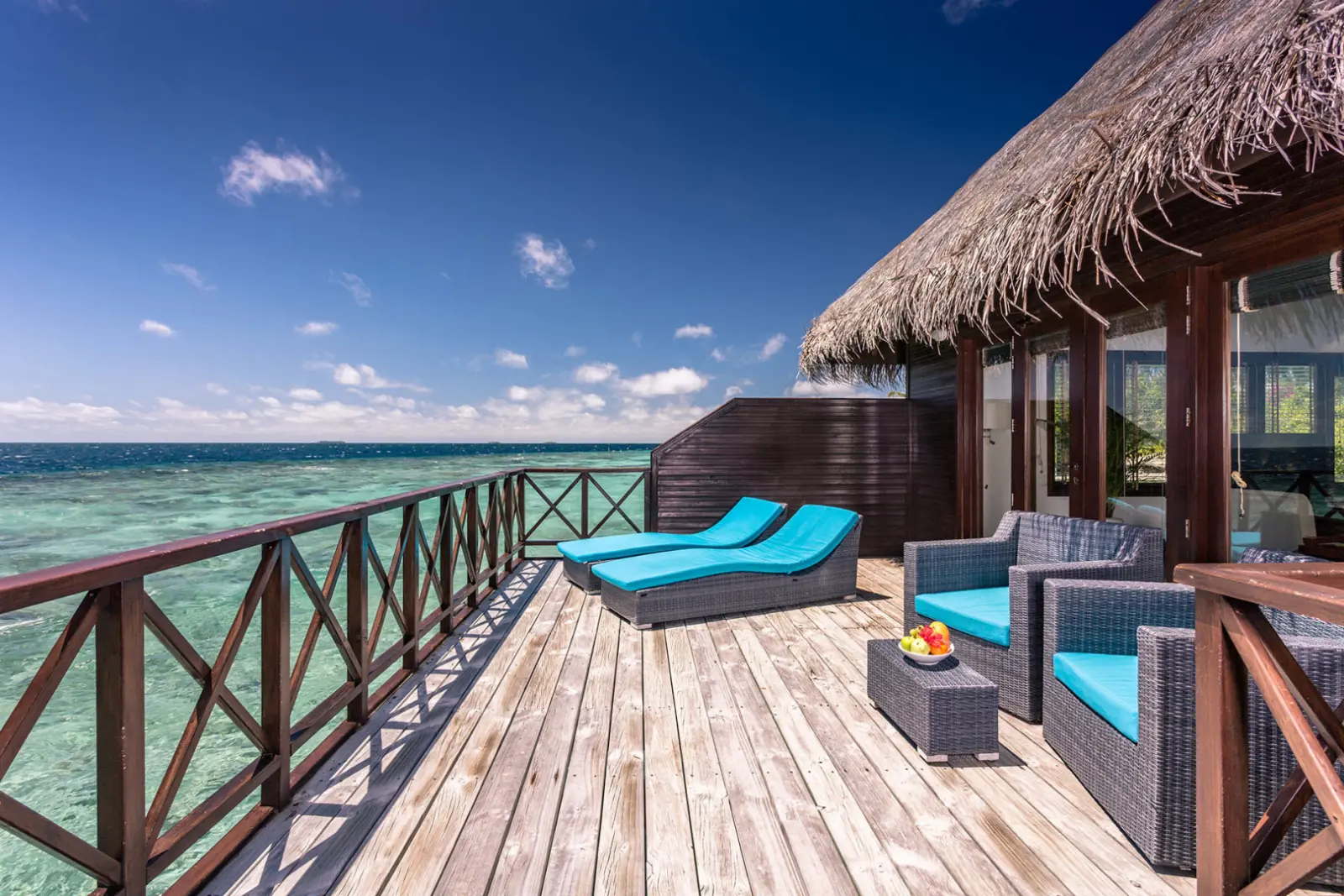 Sunset Water Villa (83 м²): Водные виллы с современным дизайном, двуспальной кроватью, ванной комнатой и террасой с частным бассейном и прямым спуском в океан.