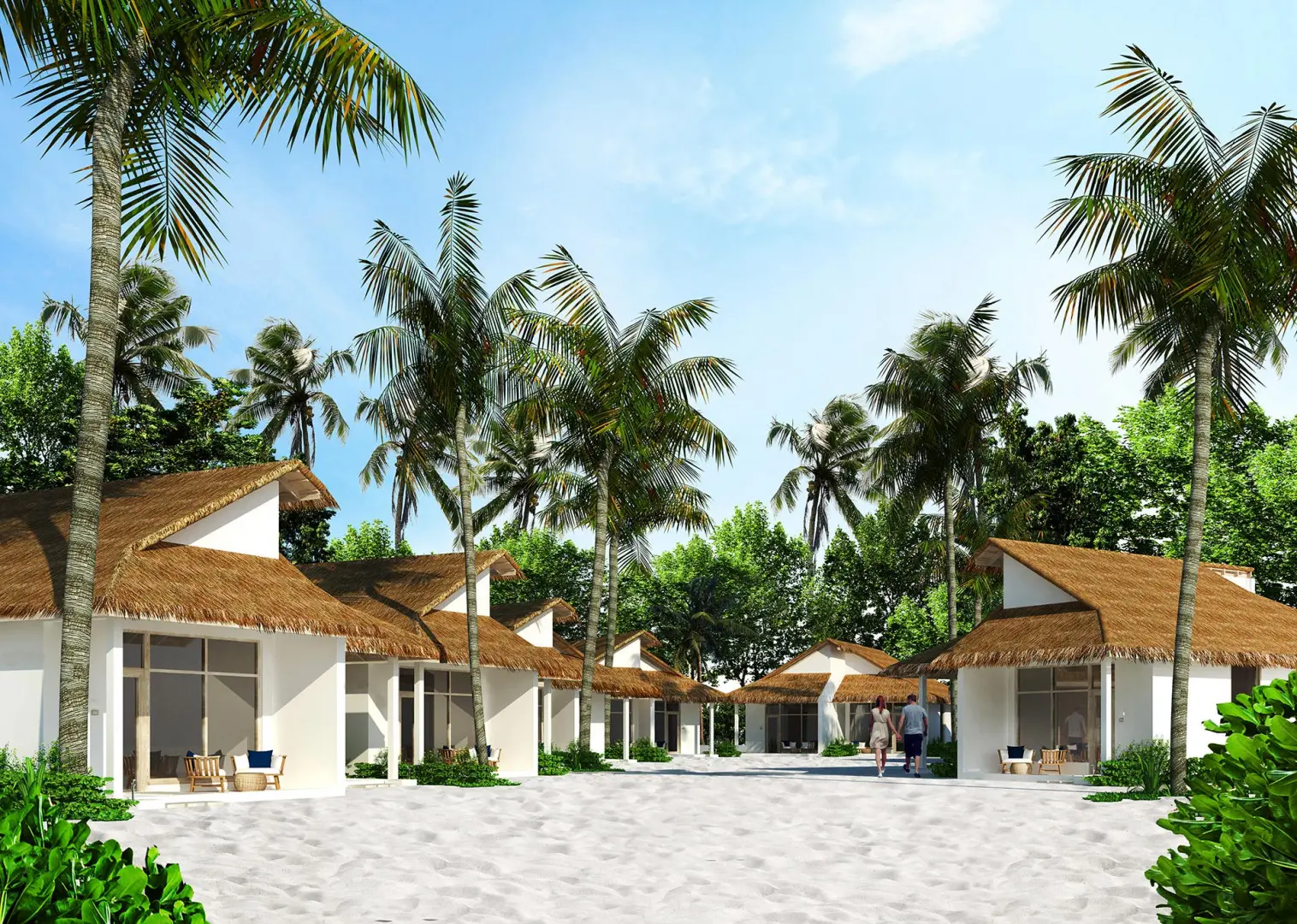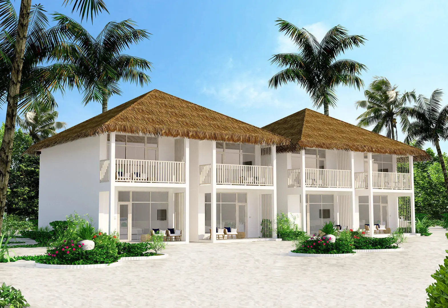 Premium Beach Villa (110 м²): Двухэтажные виллы с гостиной, ванной комнатой с душем, джакузи и душем на открытом воздухе. На втором этаже — спальня и балкон.