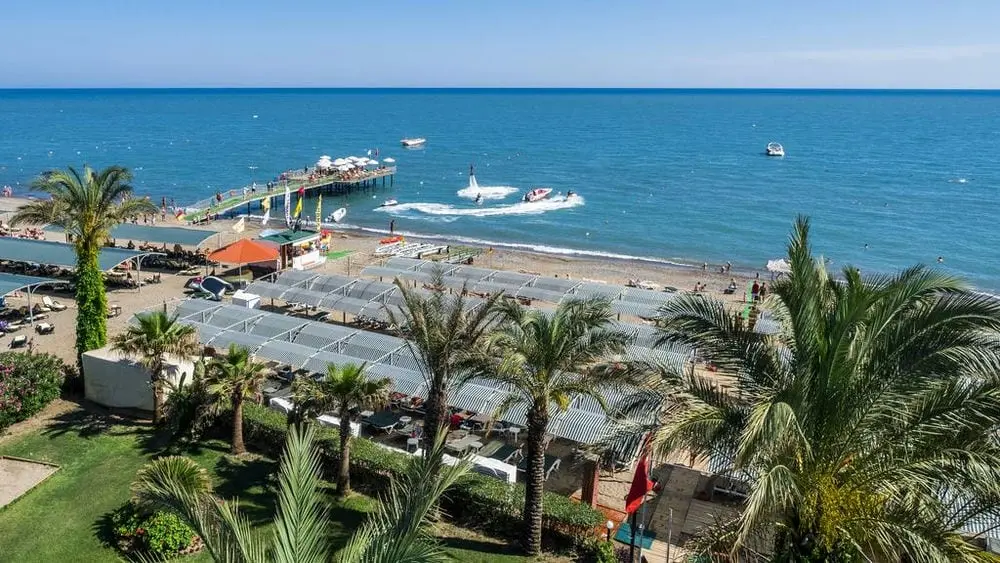 в 35 км от аэропорта, в 45 км от центра г. Анталья, в 15 км от поселка Серик, на берегу моря.