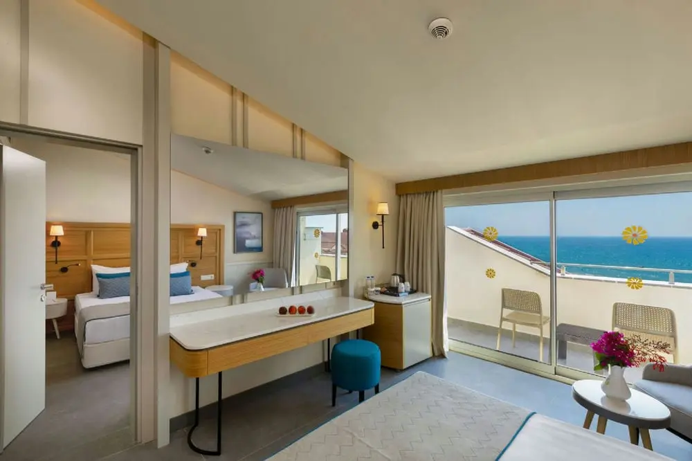 20 Family Room Sea View (42 м2, вид на море, балкон, 2 спальни с межкомнатной дверью, двуспальная кровать и 2 односпальные кровати, макс. 4 чел.).
