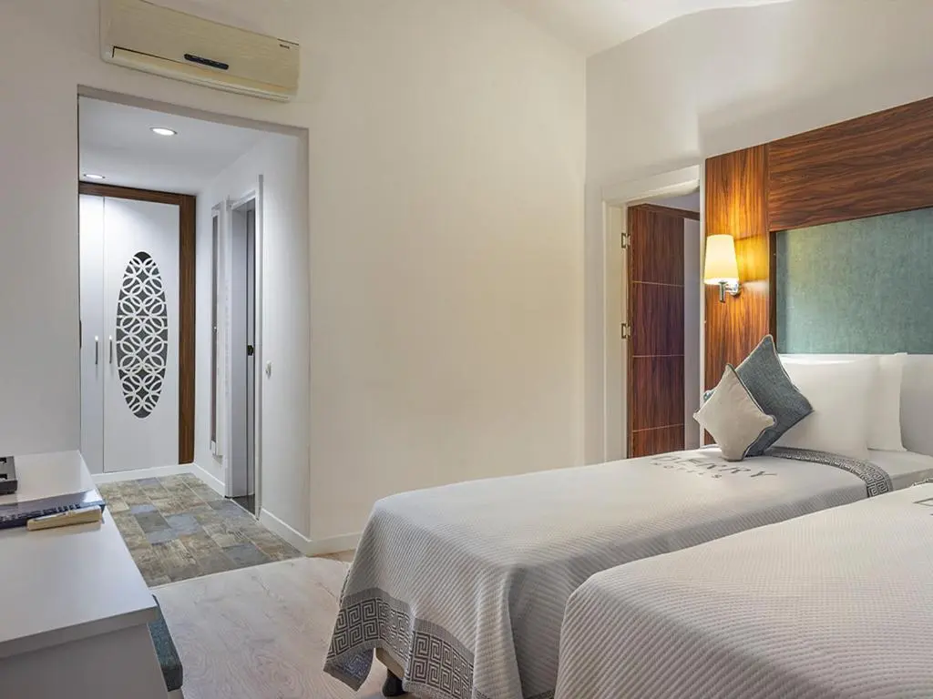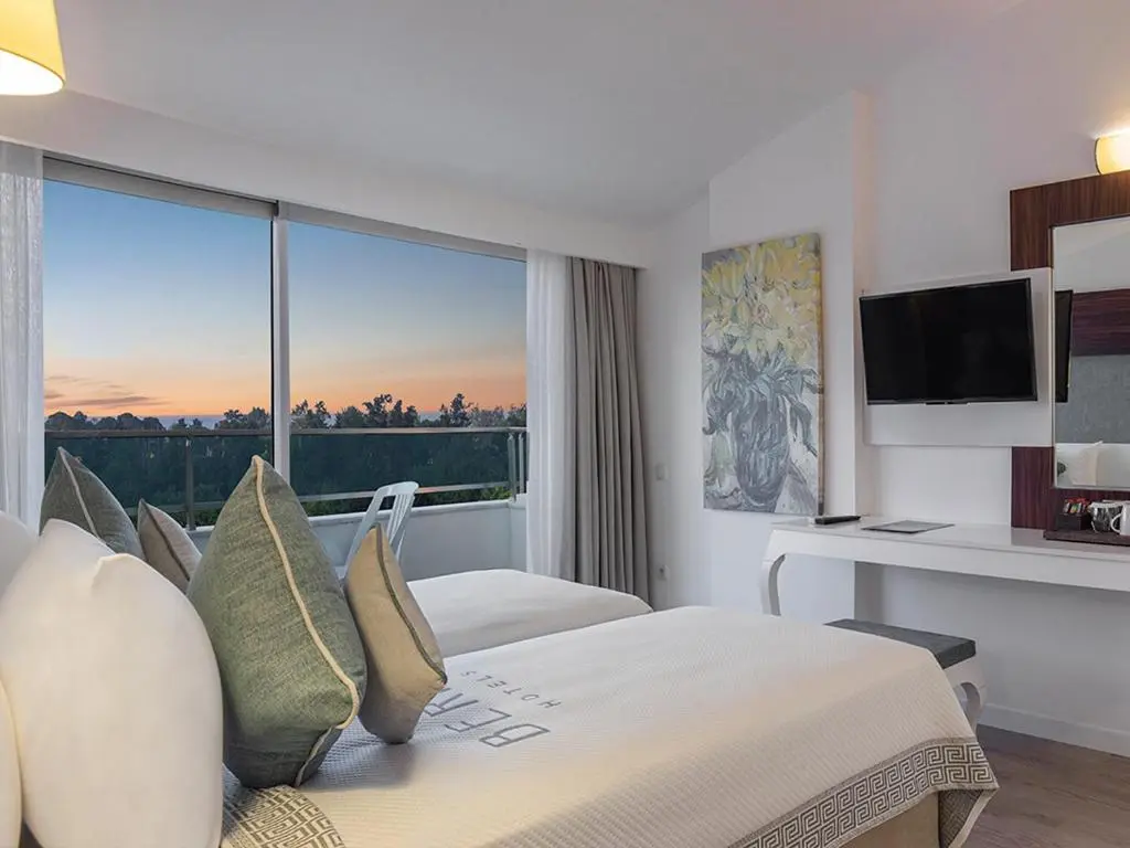 Номер: 5 этаж, 36 кв.м, двуспальная кровать (200х200), вид на бассейн, балкон, макс.3+1 чел.