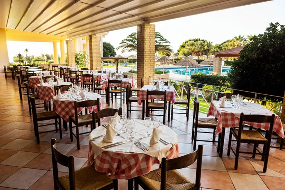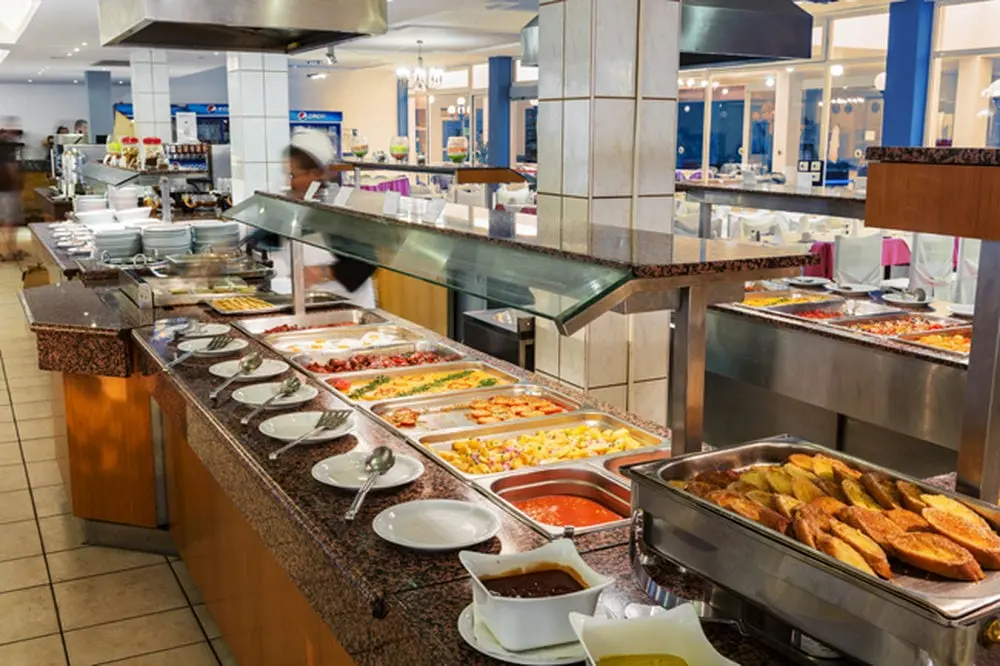 Обед: 12.30-14.30 (Суп, 8 видов свежих салатов, 4 вида смешанных салатов, выбор сыров, 4 вида горячих блюд, 3 вида главных блюд, гарниры, 5 видов десертов, 4 вида сезонных фруктов, мороженое. Напитки: вино местного производства, разливное пиво, безалкогольные напитки, соки, вода).