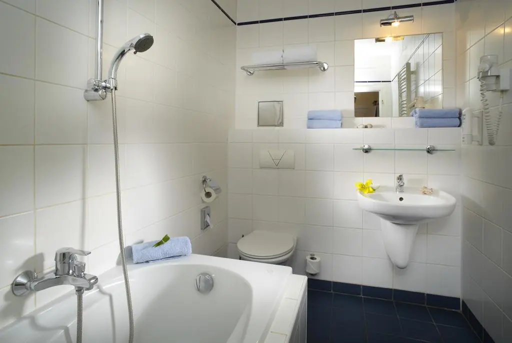 • ванная комната с ванной, туалет, фен