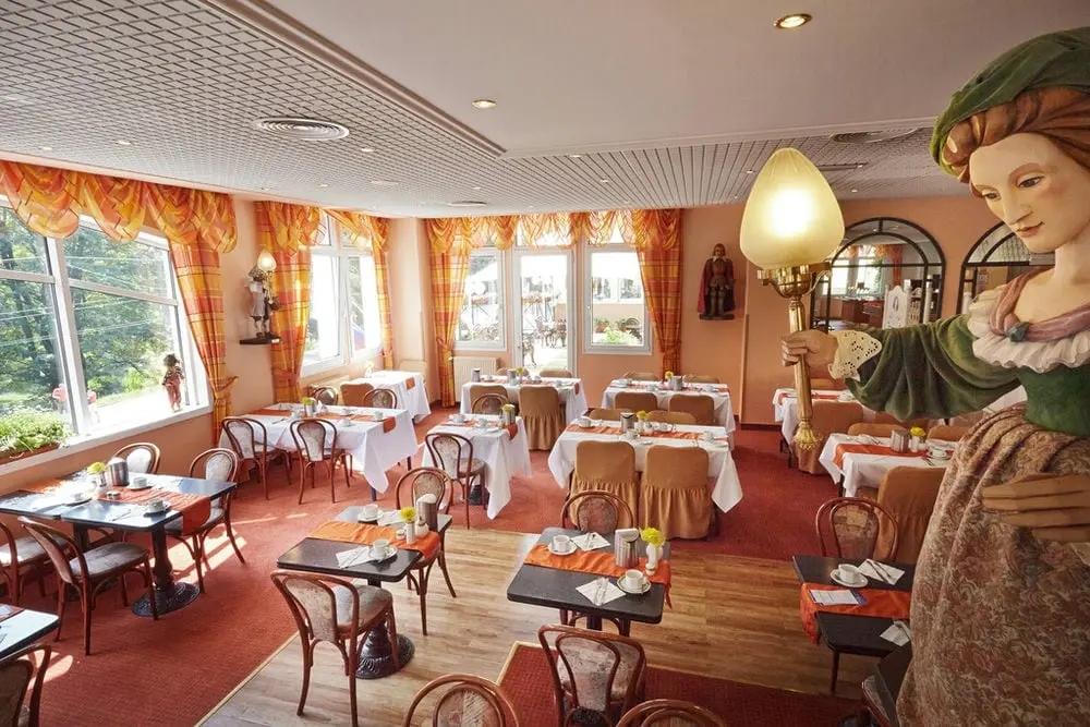 Французский ресторан с фонтаном и салоном, украшенным керамическими картинами Мадам Баттерфляй. Ужины в сопровождении звуков арфы. Большой выбор блюд чешской, венгерской и международной кухни, прекрасные повара, вина, отобранные сомелье. Предусмотрены вегетарианская, щадящая, диабетическая и другие диеты по желанию. Возможно питание a la carte. Уголок здорового питания Danubius Healthy Choice.