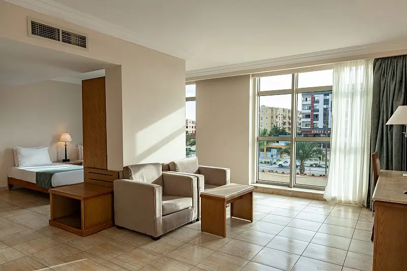 - Superior Номер (Вид на море) 75 - Спальня с двуспальной кроватью размера «King - size» или двумя односпальными кроватями, гостиная, ванная комната и балкон.
