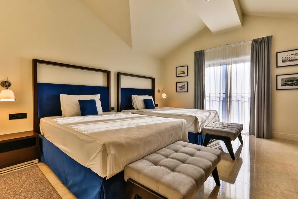 Family SV: 32 м2, терраса с видом на море, две французские кровати, гостиная зона.