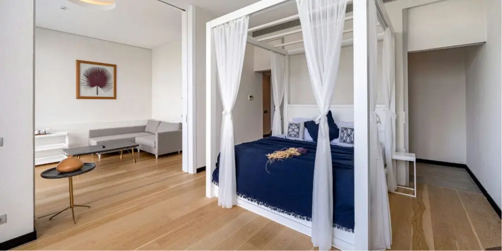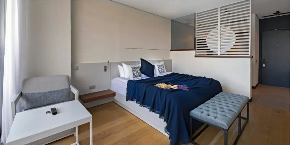 Grand Suite - 90 кв.м, расположены на последнем этаже, спальня, гостиная, дверь-слайд, панорамный вид на море, макс. 3 чел.