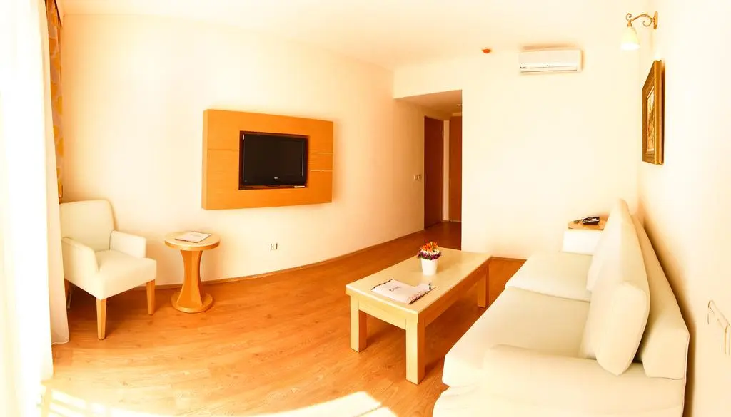 кондиционер, сейф, телефон (платно), мини-бар, телевизор, ванная комната с душевой кабиной, феном, ванными принадлежностями. Напольное покрытие - ламинат.