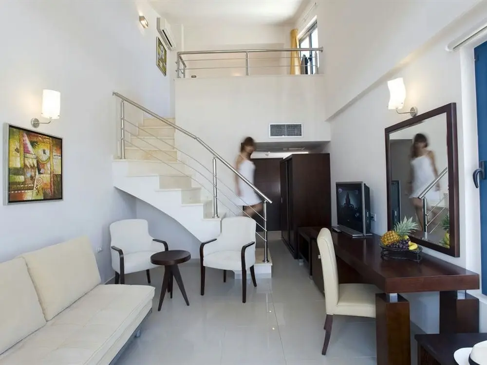 Maisonette SSV/SV Открытая планировка. Спальня на верхнем уровне (двуспальная кровать) и гостиная с диваном на нижнем уровне.