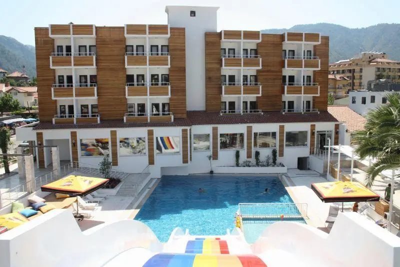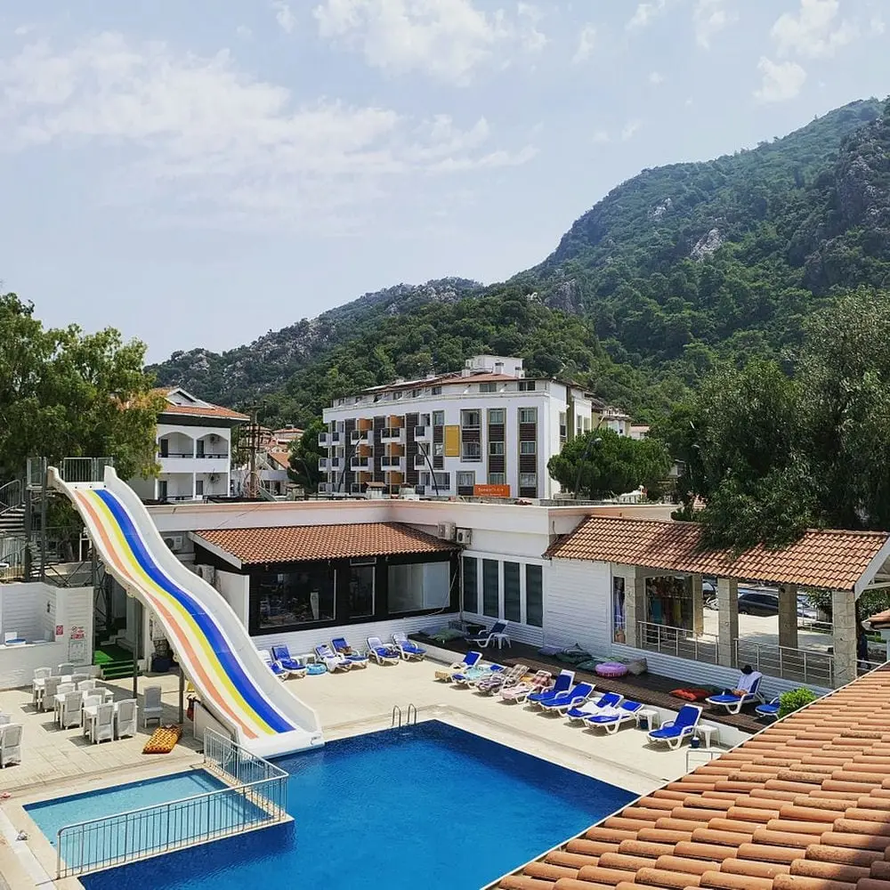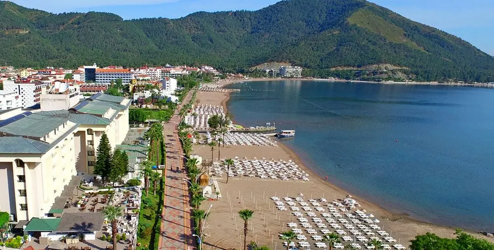 в 105 км от аэропорта г. Даламан, в 140 км от аэропорта Милас Бодрума, в 8 км от центра г. Мармарис, в 200 м от центра п.Ичмелер, в 60 м через дорогу от собственного пляжа Ичмелер на берегу Эгейского моря.