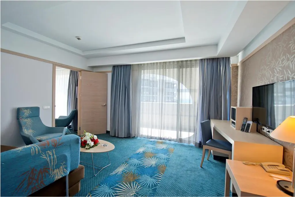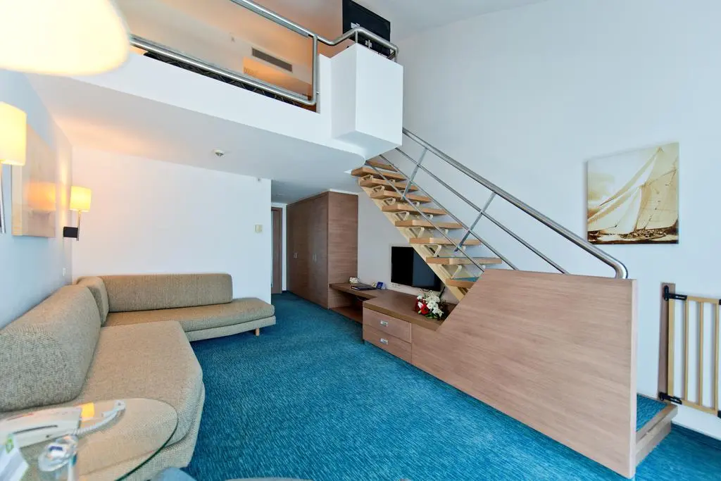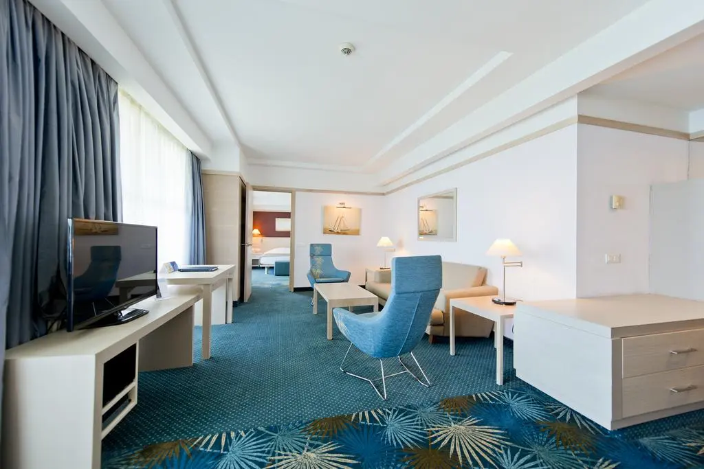 19 двухкомнатных junior suite (гостиная, спальня c дверью с king-size bed, 2 ванные: одна с ванной, другая с душем, 2 ТВ, макс. 2+2 чел., 43–56 м2);