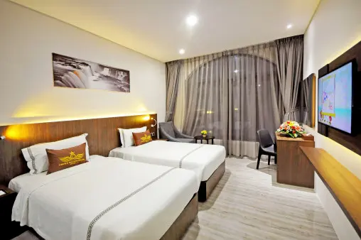 Crown Nguyen Hoang Hotel — уютный четырехзвездочный отель, расположенный в центре Нячанга, всего в 400 метрах от популярного Южного пляжа. Гости могут наслаждаться панорамным видом на город из окон номера, а также отдыхать на просторной террасе для загара. В распоряжении гостей — открытый бассейн, общий лаундж-зал и бесплатная частная парковка. Круглосуточная стойка регистрации, услуги трансфера до аэропорта, доставка еды и напитков, а также бесплатный Wi-Fi на всей территории делают пребывание максимально комфортным.