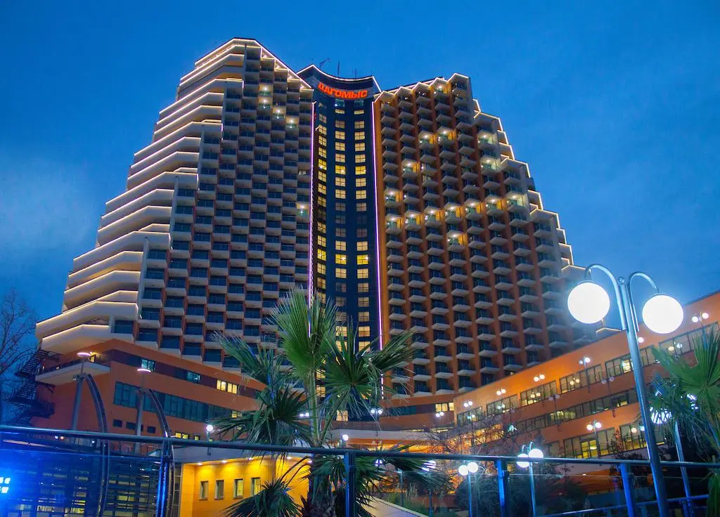Поселок Дагомыс, подаривший свое имя санаторию, находится в 12 км от центра города Сочи. Отель у моря «Дагомыс», где «все включено», состоит из основного 27-этажного корпуса, емкостью 1003 номера, а также VIP-корпуса «Меркурий», ёмкостью 12 номеров.