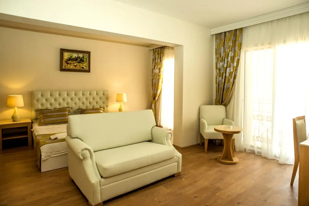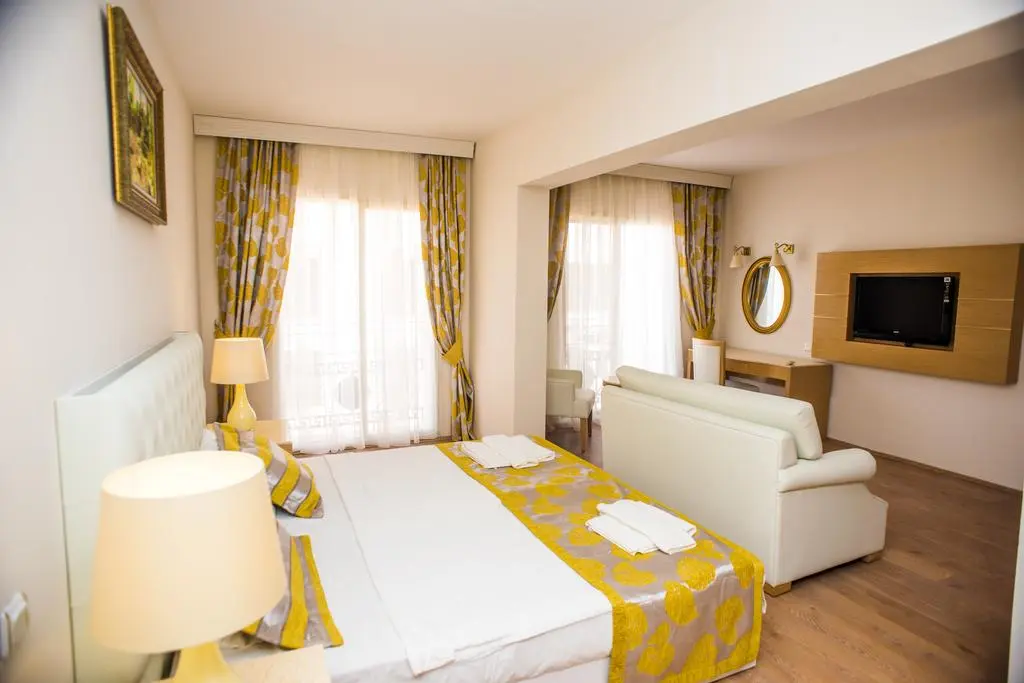 Номера курортного отеля элегантно оформлены в классическом стиле. Они оснащены кондиционером, ЖК-телевизором со спутниковыми каналами и мини-холодильником. Во всех номерах есть балкон.