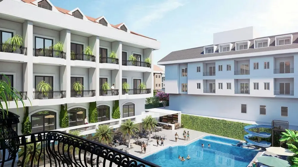 в 60 км от аэропорта г. Анталья, в 7 км от г. Кемер, в поселке Чамьюва, в 80 м от собственного пляжа.