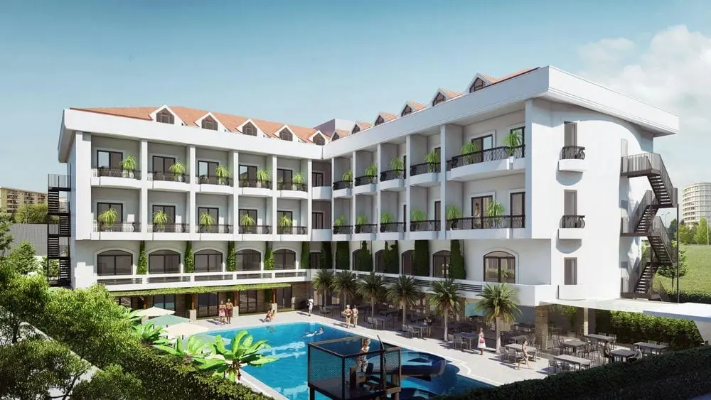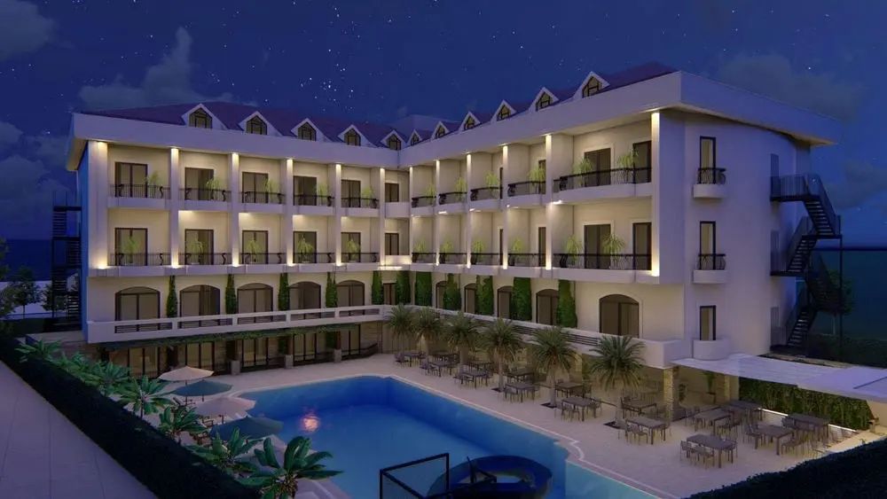 в 60 км от аэропорта г. Анталья, в 7 км от г. Кемер, в поселке Чамьюва, в 80 м от собственного пляжа.