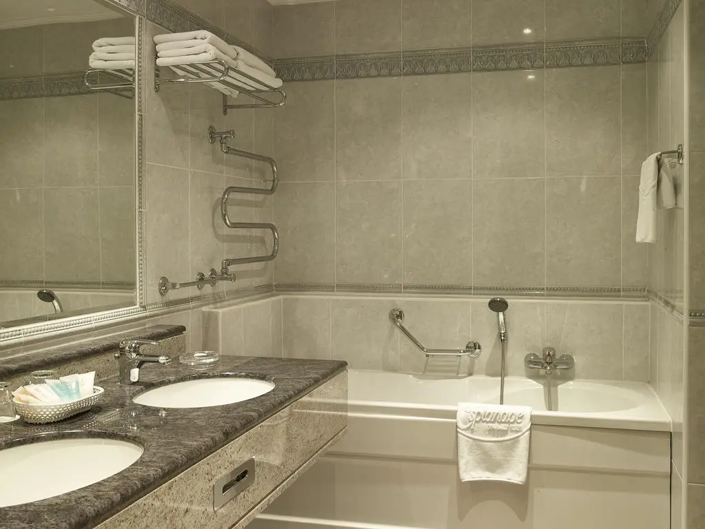 Во всех номерах : кондиционер с возможностью индивидуального выбора температуры , телефон с голосовым запоминающим устройством, wi-fi, минибар, сейф и спутниковое телевидение с 80 программами, просторные мраморные ванные комнаты оборудованы гидромассажной ванной, душевой бокс, халат, тапочки, фен и косметическое зеркало.