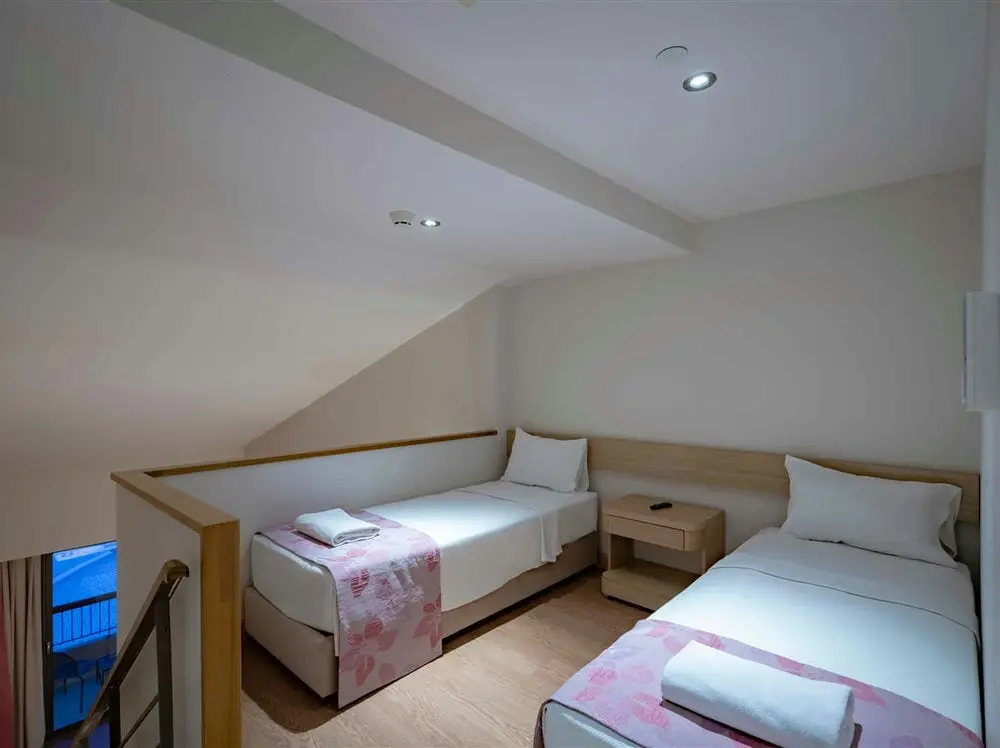 Family Dublex Suite. Общая площадь номера 39-46m2. Максимальное размещение - 5ADL. (Во всех номерах на первом этаже французская кровать, на втором этаже две отдельные кровати)