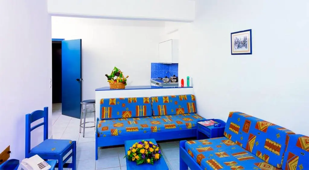 APARTMENT ONE BEDROOM (4 чел) - одна большая комната, разделенная на 2 части стеной и в части номеров и стеной и дверью. Минимальное размещение в номере - 4 человека. Все номера расположены на первом этаже. В спальне две односпальные кровати, сдвинутые вместе. В гостиной две стандартные кровати