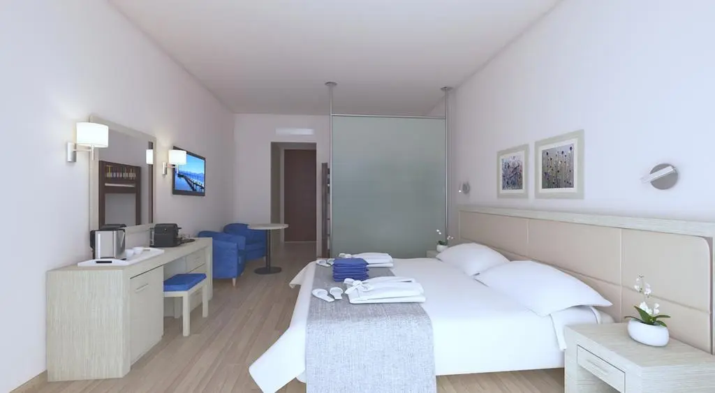 Superior sea view (27,5 кв.м., макс. 2 взрослых + ребёнок/3 взрослых) - спальня, ванная комната, балкон с видом на море, номера расположены в главном здании