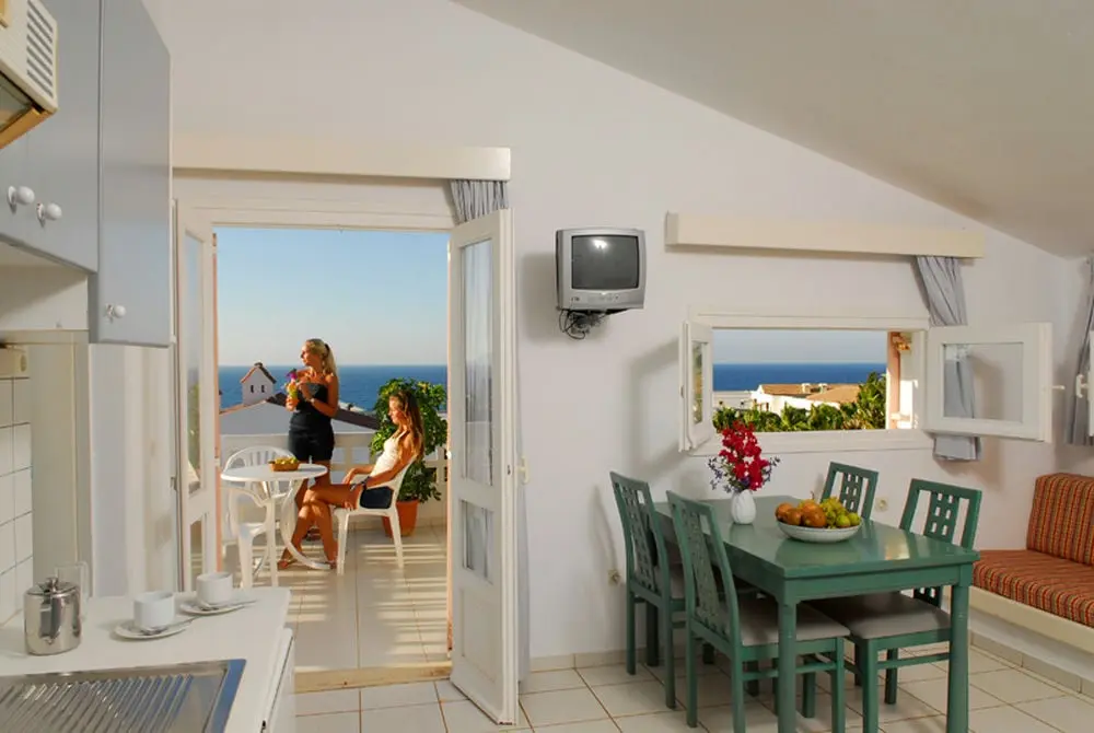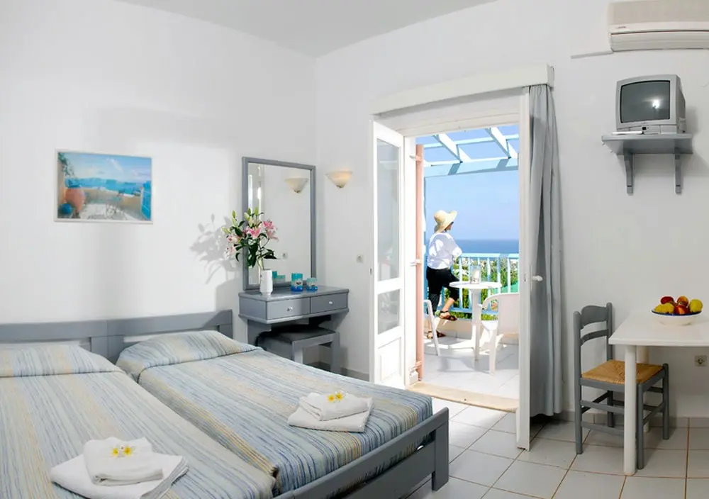 тип кровати - TWIN (односпальные кровати), дополнительная кровать - софа, WiFi, спутниковое телевидение (российские каналы), холодильник, сейф (платно), индивидуальный кондиционер, телефон, туалет, душ, фен, кухонный уголок, балкон или терраса