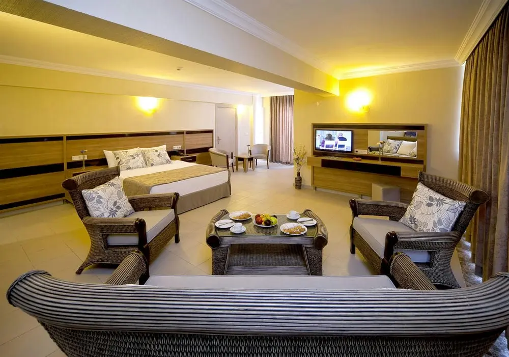 Импортные напитки, все напитки в бутылках, свежевыжатые соки, турецкий кофе, обслуживание в номере - платно.