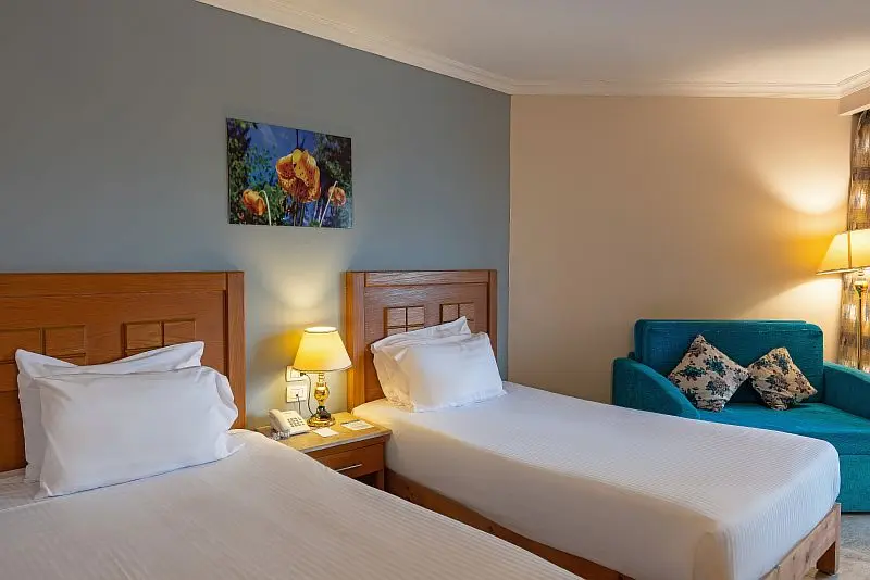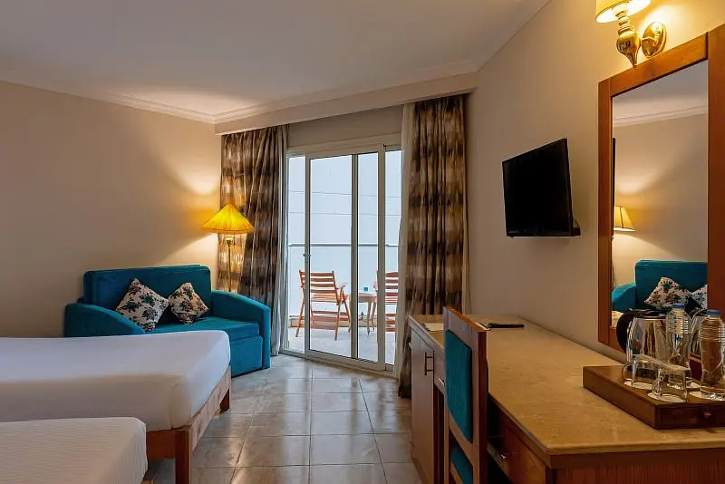 - Стандартный Номер (Вид сзади / на бассейн / частичный вид на море ) 100 - Спальня с двуспальной кроватью размера «Queen - size» или двумя односпальными кроватями, гостиная зона, ванная комната с душем, балкон