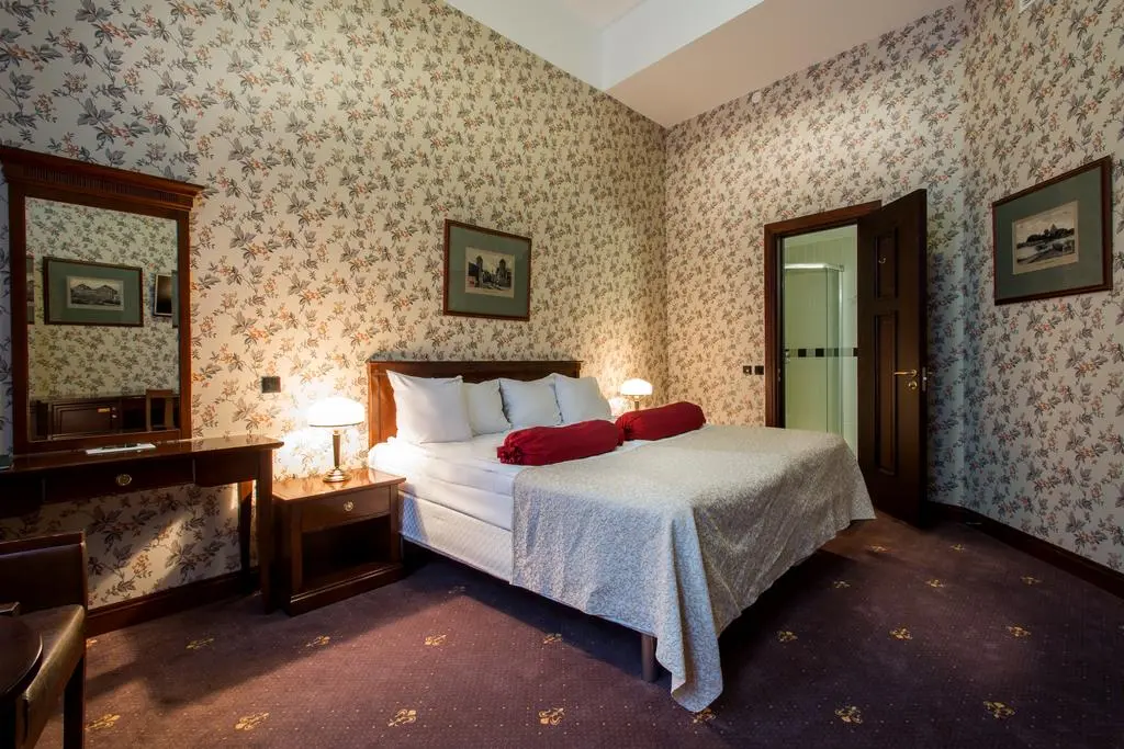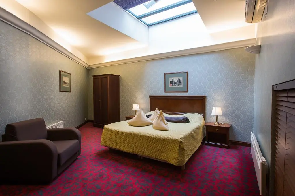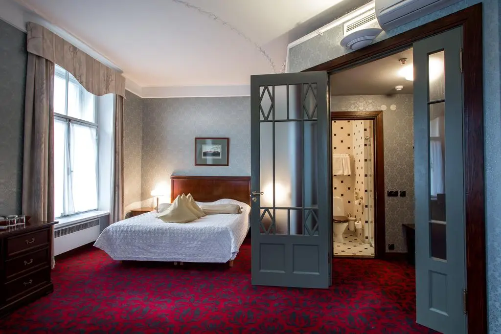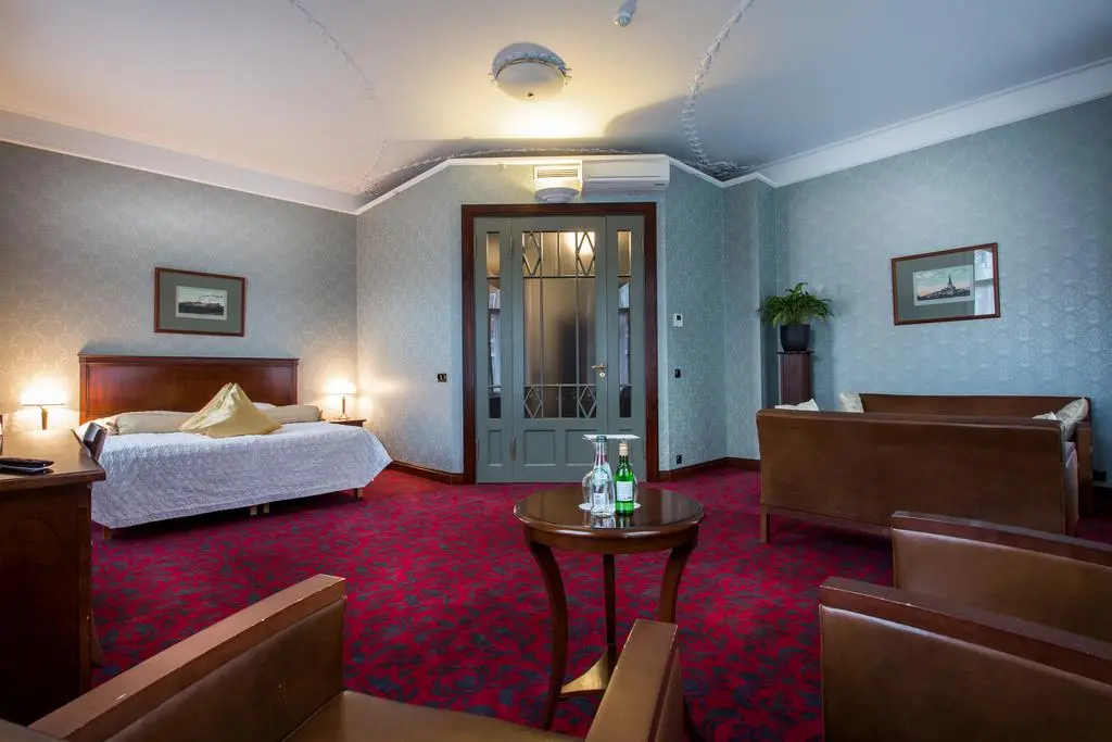 Люкс площадью 39 кв. метров обставлен с классической элегантностью и оснащен большой двухместной кроватью. В номере также есть TV, бесплатный WiFi, телефон, приватная ванная комната с душем и баней, фен, халат с тапочками, возможность приготовления чая и кофе, минибар и рабочий стол.