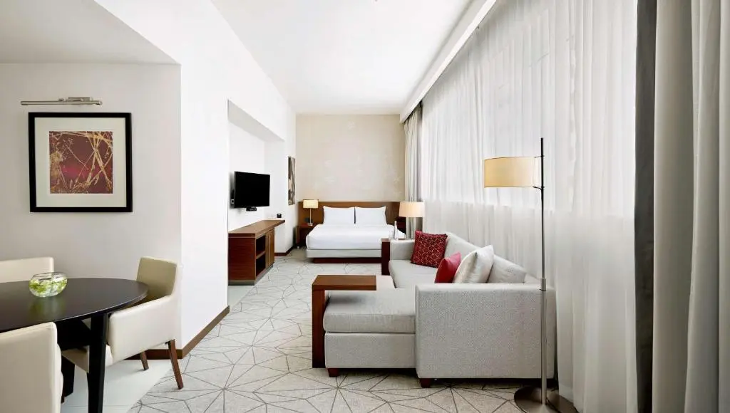 King Bed Suite (with sofa bed) площадью 48 кв. м., размещением чел. с кроватью размера king-size и матрас Hyatt Eurotop, угловой диван-кровать, отдельная гостиная, обеденная зона, отдельное рабочее пространство.