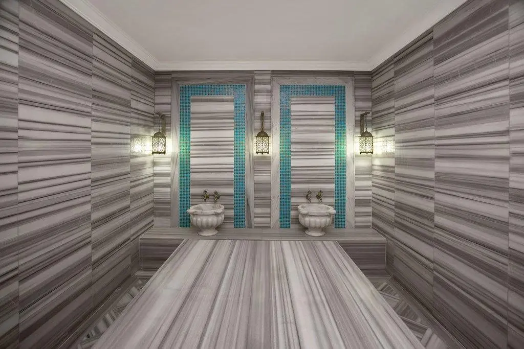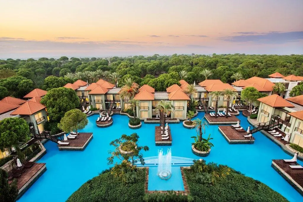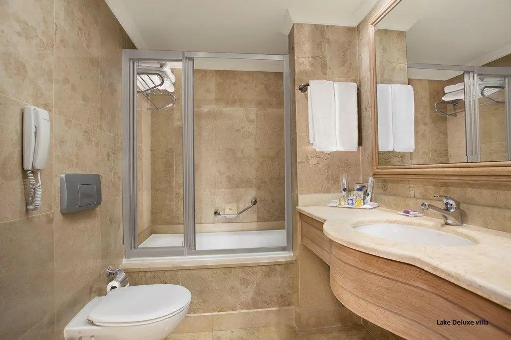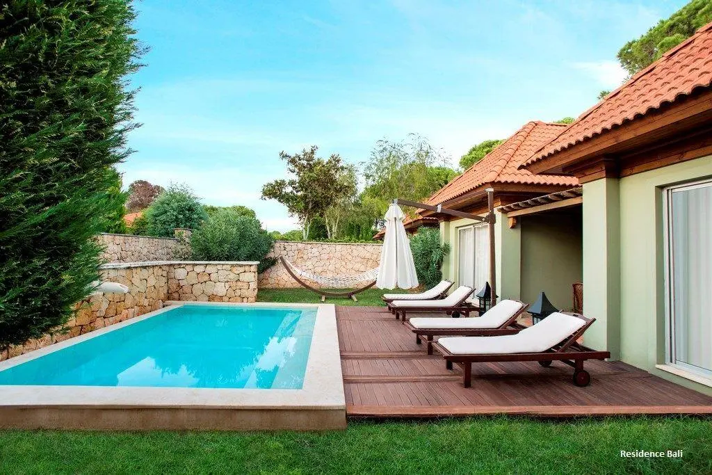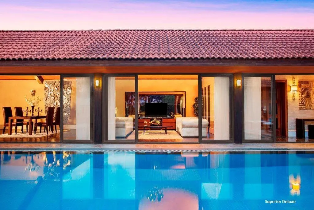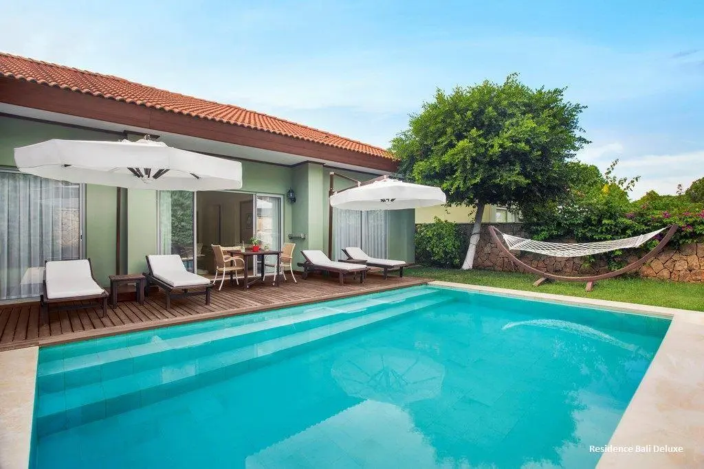 - 4 четырехкомнатных Superior Deluxe Villa (гостиная с американской кухней, барная стойка, 3 спальни с дверью, 3 ванные: одна с джакузи, две с душем, с подогреваемым полом, 4 ТВ, терраса, собственный бассейн (38 м2), макс. 6+2 чел., общая площадь 396 м2, жилая площадь 202 м2, отдельная огороженная территория, турецкая баня, массажный стол, мебель, VIP-сервис).