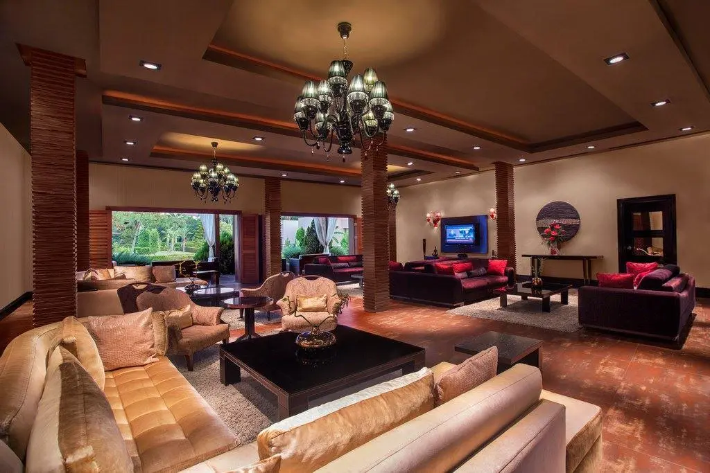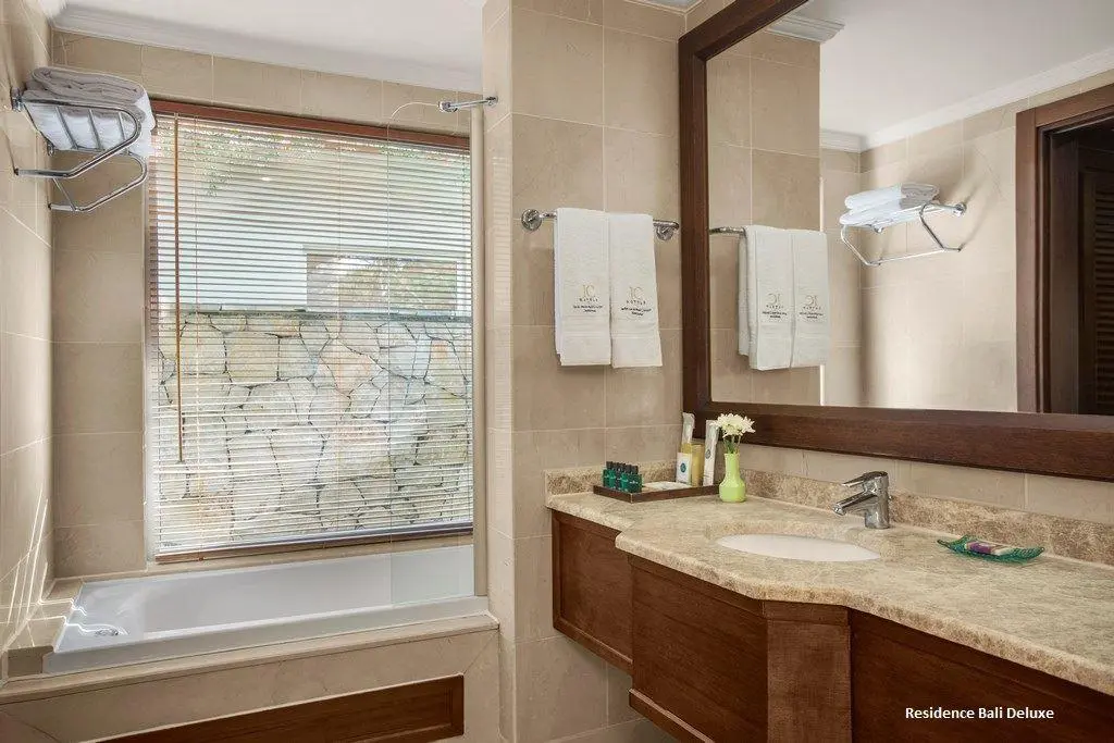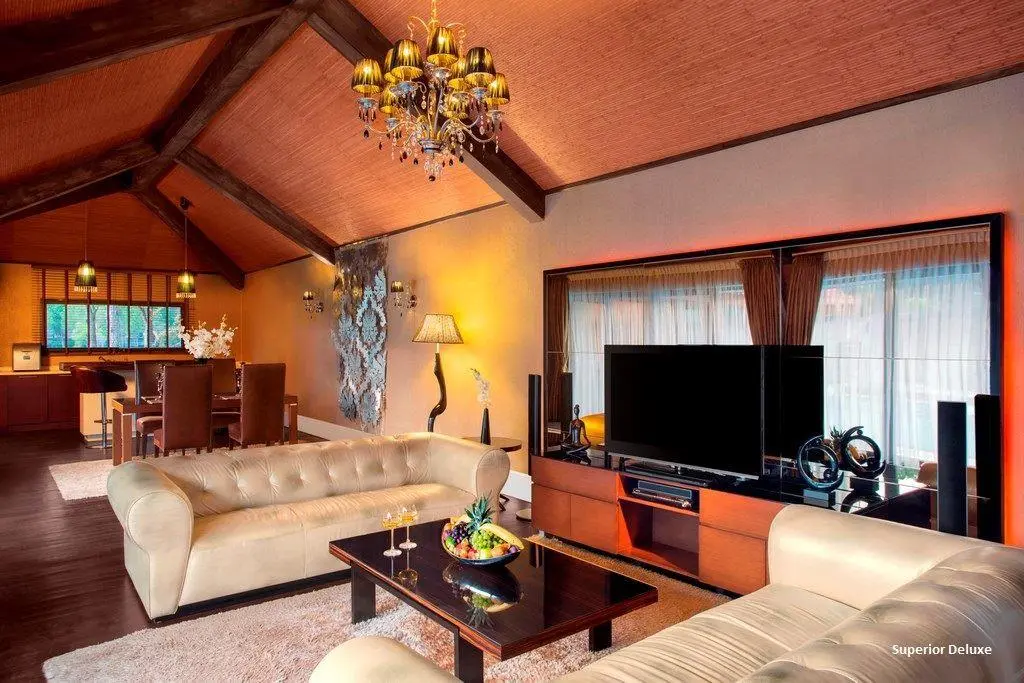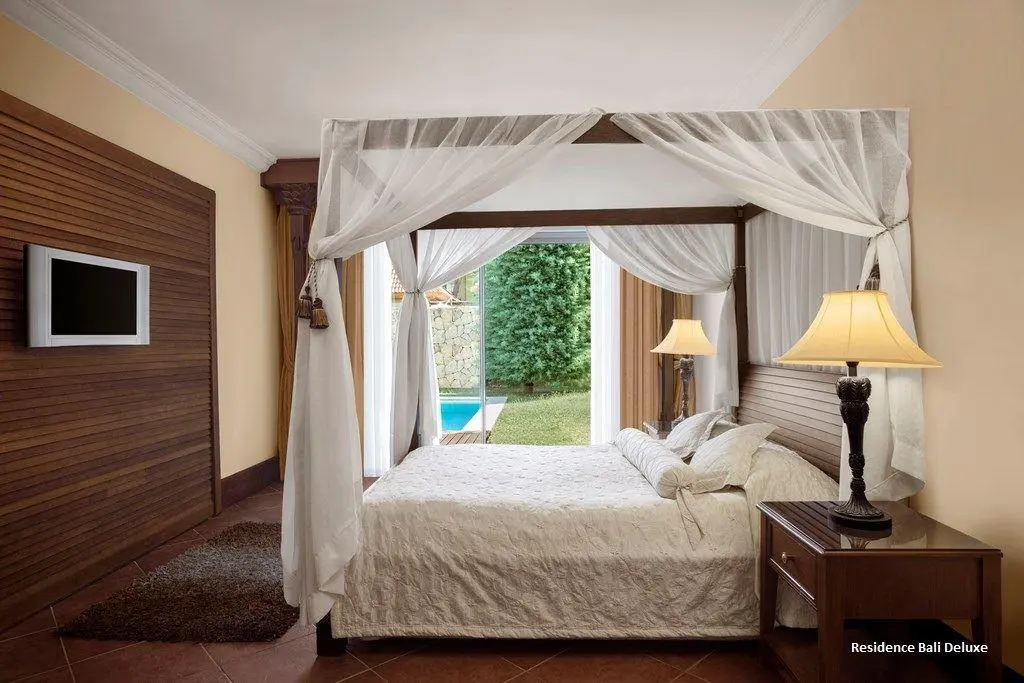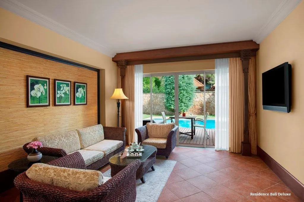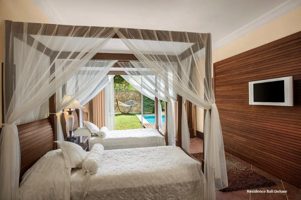 - 4 трехкомнатных Bali Deluxe Villa (гостиная, мини-кухня, 2 спальни с дверью, 2 ванные комнаты: одна с джакузи и душем, другая с ванной, 3 TВ, собственный бассейн (35 м2), макс. 4+2 чел., общая площадь 300 м2, жилая площадь 105 м2, сад огорожен забором, VIP-сервис);