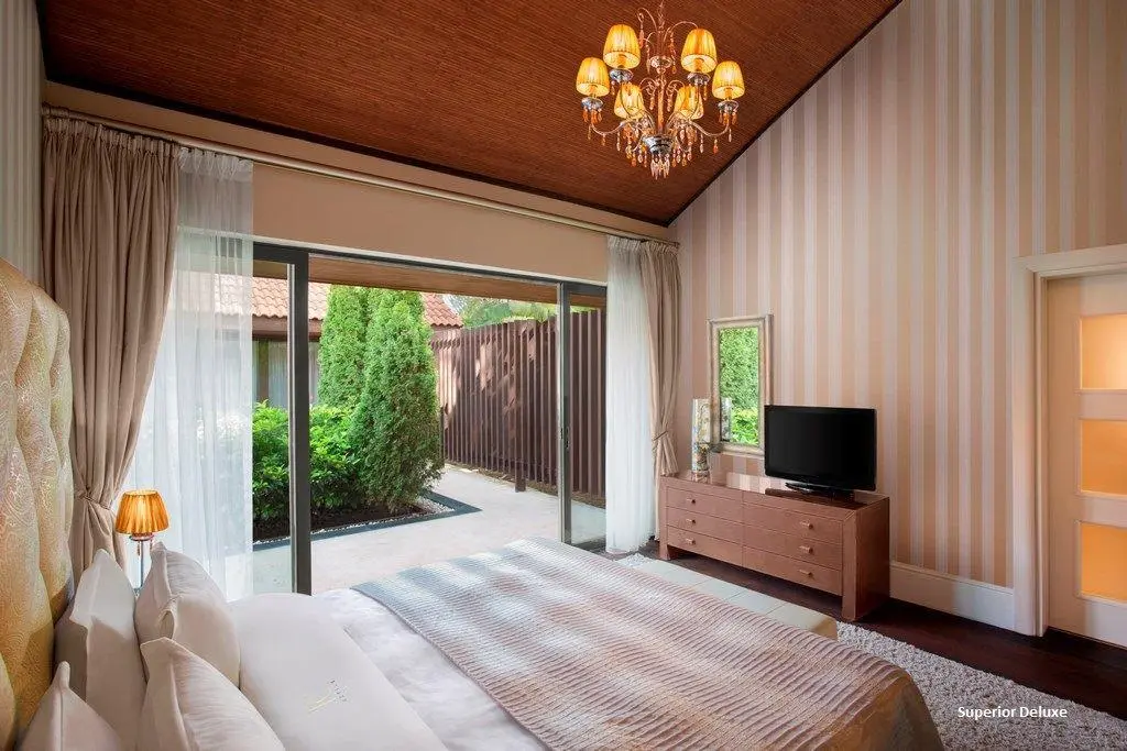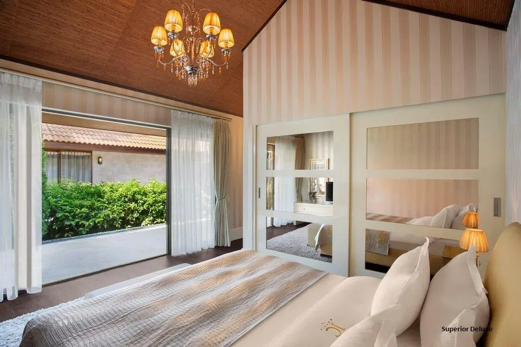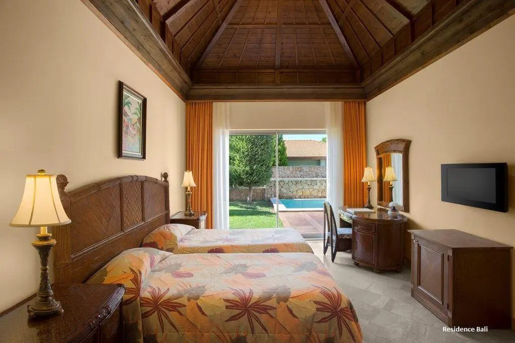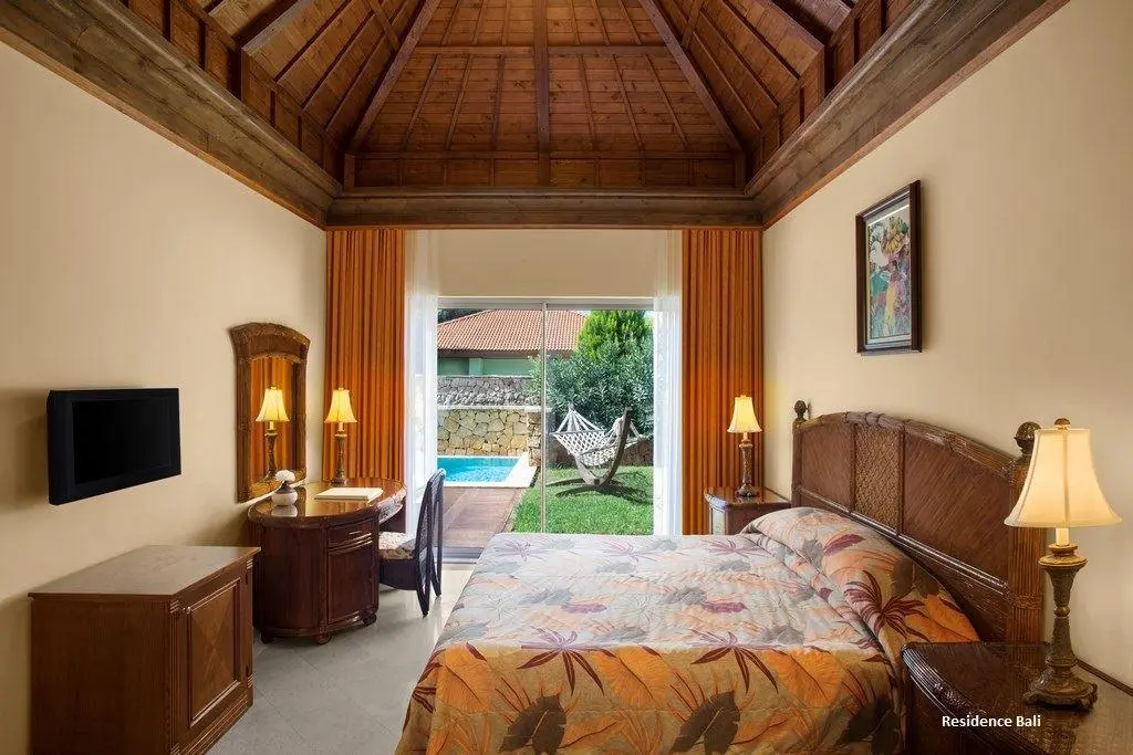 - 3 двухкомнатных Bali Villa (гостиная на открытом воздухе, терраса под навесом, 2 спальни с дверью, 2 ванные: одна с джакузи и душем, другая с ванной, 2 ТВ, собственный бассейн (20 м2), макс. 4+2 чел., общая площадь 323 м2, жилая площадь 54 м2, сад огорожен забором, VIP-сервис);