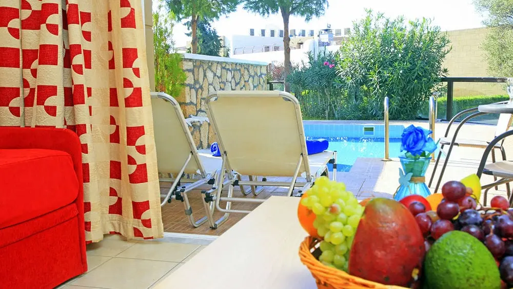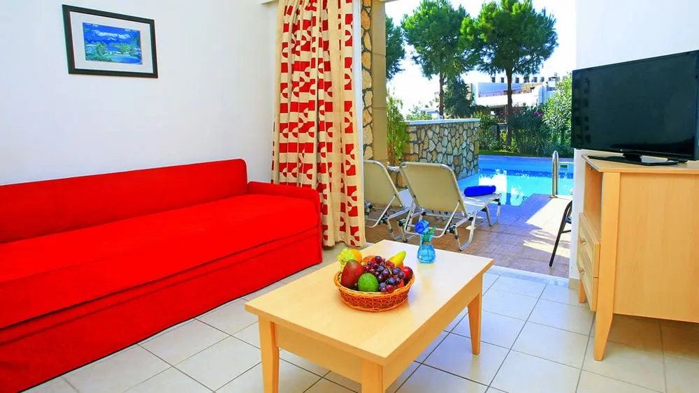 - В этом номере основная спальня с двумя односпальными кроватями, отдельная спальня с двумя односпальными кроватями или с софой, ванная комната с ванной, собственная меблированная терраса и свой доступ к общему бассейну.
