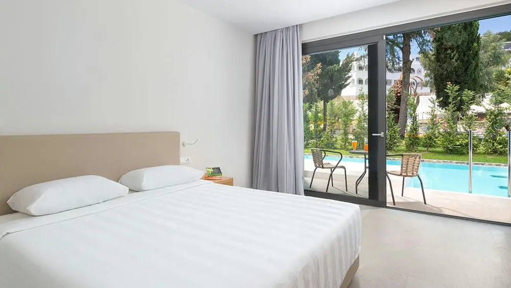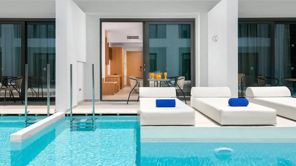 Suite Swim Up - Одна двуспальная кровать и две стандартные односпальные кровати. Состоит из двух комнат и зоны отдыха. Он оформлен в земных тонах и имеет общий бассейн с отдельными шезлонгами.