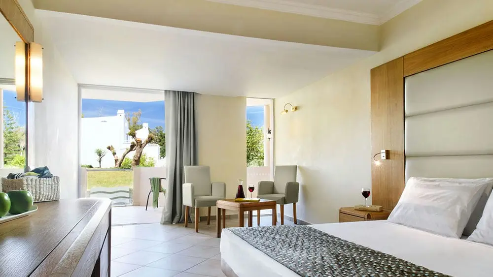 Junior Suite Sea View - Номера открытой планировки состоят из двух зон, разделенных ступенями на уровни. В номере установлена 1 двуспальная и две односпальные кровати или 1 двуспальный диван-кровать.